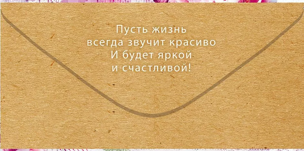 Подарочный конверт изготовлен из плотного картона. Материал хорошо держит форму и не помнется при транспортировке. Сверху на картонной основе отпечатано красочное полноцветное изображение. На обратной стороне есть теплые пожелания.