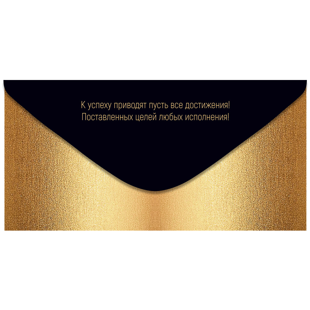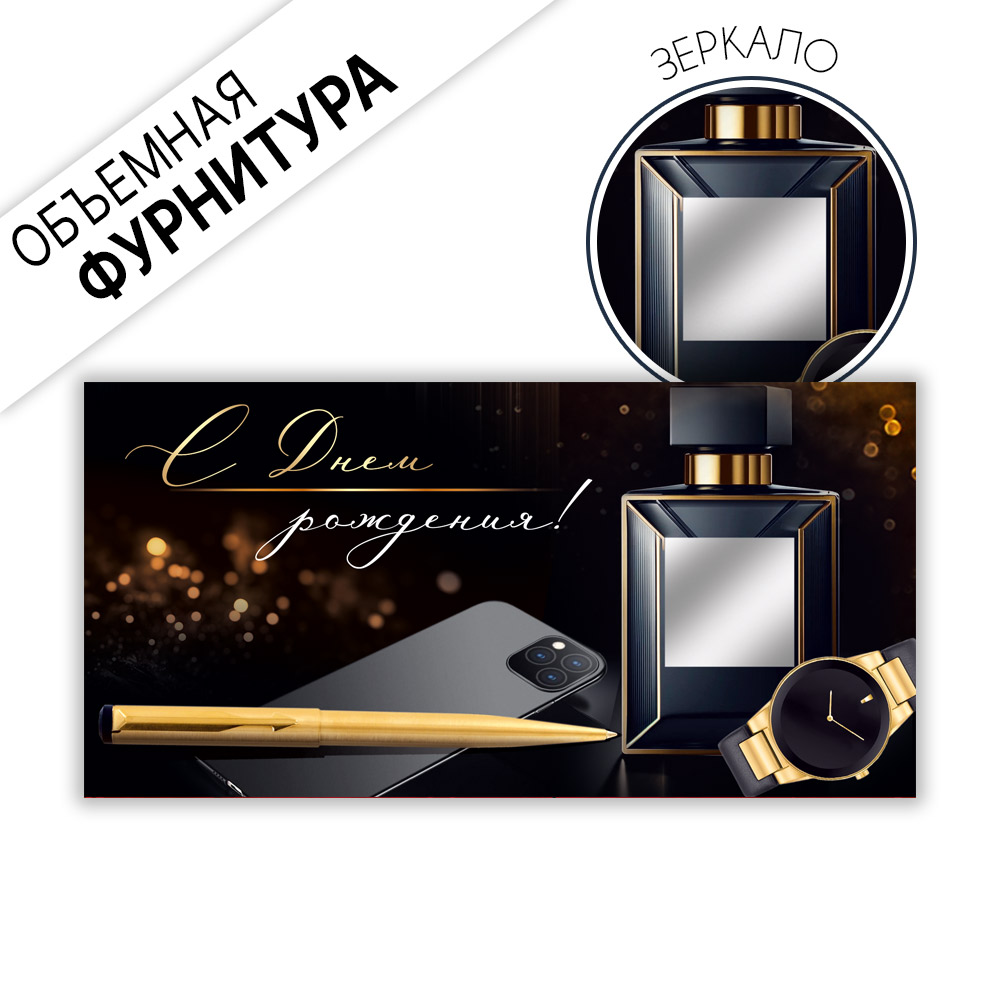 Конверт для денег формата «Евро» предназначен для вручения денежного подарка на день рождения и рассчитан на использование в розничной и корпоративной подарочной упаковке. Изделие изготовлено из плотного картона, что обеспечивает форму и устойчивость при транспортировке и хранении, а также позволяет конверту выдерживать многократные перекладывания в коробах и стеллажах без деформации. Габариты готового изделия 168×84 мм оптимальны для размещения стандартных купюр без сгибания и подходят под большинство витринных и складских лотков. Конструктив с зеркалом предусматривает внутренний элемент с отражающей поверхностью, который служит декоративным акцентом и одновременно делает изделие более заметным в ассортиментной выкладке. Лицевая сторона оформлена полноцветным изображением в темной гамме с акцентом на металлические оттенки и современную мужскую атрибутику (часы, ручка, флакон парфюма, смартфон), а также содержит поздравительный текст «С Днем рождения!», что позволяет использовать конверт без дополнительной открытки. Отделка не применяется, поверхность гладкая, удобна для машинной или ручной укладки в коробки, пакеты и почтовые отправления. Картон хорошо держит сгибы клапанов, не растрескивается по линии фальца, что важно при оптовых поставках и длительном обороте складских остатков. Конверт подходит для использования в магазинах подарков, книжных и канцелярских отделах, цветочных и сувенирных салонах, а также в компаниях при подготовке подарков сотрудникам и партнерам: нейтральный, деловой дизайн ориентирован преимущественно на мужскую аудиторию и уместен для широкого круга получателей. В упаковке 1 штука, что облегчает формирование комбинированных наборов и точный учет при розничной продаже и оптовой фасовке поштучно или в собственные транспортные коробки.