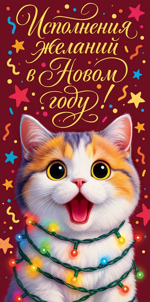 Конверт для денег формата Евро предназначен для оформления денежных подарков к Новому году и рассчитан на использование в розничной продаже и оптовых поставках для магазинов подарочной продукции, канцтоваров и сувенирных отделов. Изделие выполнено из плотного картона, что обеспечивает стабильную форму, аккуратный внешний вид и устойчивость к деформации при транспортировке и хранении в коробах или стеллажных лотках. Готовый размер конверта 168 × 84 мм обеспечивает совместимость с большинством стандартных купюр и позволяет использовать его в качестве универсального решения для денежных подарков, подарочных сертификатов или небольших плоских вложений. Лицевая сторона оформлена полноцветным новогодним изображением с котом и декоративными элементами, дизайн дополнен поздравительным текстом «Исполнения желаний в Новом году!», что делает изделие самодостаточным поздравительным носителем без необходимости дополнительной открытки. Применена фигурная вырубка, за счет чего конверт имеет аккуратные контуры и удобные клапаны для фиксации вложения. Отделка выполнена с использованием золотых блесток в лаке, создающих локальные глянцевые акценты и устойчивый к истиранию декоративный слой, пригодный для длительного экспонирования на витрине и многократного перекладывания при выкладке. Конверт поставляется по 10 штук в упаковке, что удобно для планирования заказов, формирования ассортиментных позиций и оптимизации складского учета. Изделие подходит для сезонных новогодних коллекций, может использоваться как самостоятельная товарная единица или как дополнение к подарочным наборам, гармонично сочетается с типовыми витринными решениями и обеспечивает единый визуальный стиль новогоднего ассортимента.