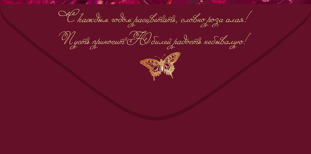 Конверт для денег формата «Евро» предназначен для оформления денежных подарков к юбилейным датам и может использоваться в ассортименте сувенирной продукции как универсальное решение для розничной и корпоративной поздравительной линейки. Изделие изготовлено из плотного картона, что обеспечивает сохранность формы, устойчивость к изгибам и истиранию при транспортировке и выкладке в торговом зале. Готовый размер конверта 168 × 84 мм позволяет удобно размещать стандартные банкноты без сгибов и деформации, что важно при массовых закупках для магазинов, интернет-ритейла и компаний, формирующих подарочные наборы. Лицевая сторона оформлена полноцветным изображением в насыщенной бордово-розовой гамме: композиция из роз, чашки с горячим напитком и декоративных бабочек, дополненная крупной надписью «С Юбилеем!» и золотистыми акцентами. Отделка выполнена с использованием золотых блесток в лаке, создающих выразительный глянец и повышающих износостойкость печатного слоя за счет защитной лакової пленки, что особенно важно при частых тактильных контактах на витрине и в процессе пересылки. Конверт имеет фигурную вырубку, за счет чего край и элементы дизайна смотрятся более выразительно, а изделие выделяется в линейке стандартных моделей, что удобно для формирования дифференцированного ассортимента. Внутри предусмотрен текст с поздравлением, позволяющий использовать конверт без дополнительной открытки, что сокращает время обслуживания в рознице и упрощает подбор подарка конечному покупателю. Плотный картон и компактный формат обеспечивают удобство штабелирования, хранения и упаковки транспортных партий, снижают риск повреждений при логистике. В упаковке 10 конвертов, что удобно для планирования полочного запаса и пополнения ассортимента в сезон повышенного спроса на поздравительную продукцию к юбилеям.
