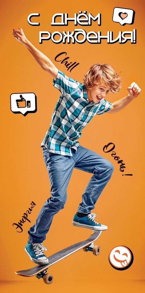 Конверт для денег формата «Евро» предназначен для дарения денежных средств на день рождения, ориентирован преимущественно на подростковую и молодёжную аудиторию. Готовое изделие изготовлено из плотного картона, что обеспечивает стабильную геометрию, устойчивость к изгибам и удобство при хранении и транспортировке в коробах и лотках. Размеры в сложенном виде 168×84 мм позволяют закладывать стандартные купюры без сгибов, а также небольшие поздравительные записки. На лицевой стороне размещена яркая полноцветная композиция с изображением подростка на скейтборде на однотонном оранжевом фоне, дополненная современными графическими элементами, пиктограммами и поздравительным текстом «С днём рождения!» в крупном читаемом шрифте; присутствуют короткие надписи в молодежном стиле, подчеркивающие динамику и тематику активного отдыха. Конверт имеет фигурную вырубку, благодаря которой изделие визуально выделяется на полке, облегчает сегрегацию ассортимента по сериям и делает упаковку более заметной в витринной выкладке. Отделка выполнена глянцевым УФ-лаком, что придаёт изображению выраженный блеск, усиливает цветопередачу, повышает стойкость к истиранию и влаге при многократном перекладывании, а также снижает риск выцветания при экспонировании под освещением в торговом зале. Внутри предусмотрен заранее нанесённый поздравительный текст, что сокращает время подготовки подарка для конечного покупателя и снижает потребность в дополнительных открытках. Конверт поставляется по 10 штук, удобен для формирования тематических выкладок по дням рождения и для планирования оптовых закупок в сегменте недорогой поздравительной упаковки. Изделие подходит для использования в розничных магазинах подарков, канцелярии и супермаркетах, а также для корпоративных поздравлений подростков и молодых сотрудников в учебных и спортивных организациях.