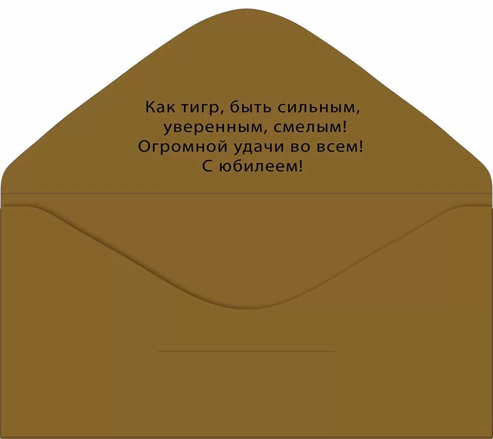 Поздравительный конверт для денег «С юбилеем!» со стильным дизайном преобразит любое торжество. Сочетание черного и золотого оттенков, изображение тигра и строгие линии делают внешний вид конверта лаконичным и запоминающимся. Также внутри находится текст с приятными пожеланиями. Данный дизайнерский конверт для денег идеально подойдет в качестве основного подарка или как приятное дополнение к нему. Внутрь можно поместить любую денежную сумму, подарочный сертификат или билеты на концерт. Благодаря прочным материалам производства и качеству печати изделие удобно транспортировать и хранить – оно надолго сохранит свой яркий внешний вид, не помнется и не выцветет, что делает его не только хорошим подарком, но и прекрасным памятным сувениром!