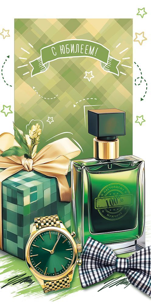 Конверт для денег формата Евро предназначен для оформления денежного подарка к юбилею и рассчитан на использование в розничной продаже и оптовых поставках. Изделие изготовлено из плотного картона, обеспечивающего стабильную геометрию при хранении и транспортировке, а также устойчивость к изгибам и истиранию в процессе обращения. Готовый размер 168 × 84 мм позволяет помещать внутрь стандартные купюры без сгибов и деформации, что удобно как при единичной покупке, так и при формировании ассортимента для сетевой розницы и подарочных отделов. На лицевой стороне размещена тематическая композиция к мужскому юбилею: подарочная коробка, флакон парфюма, часы и бабочка на фоне графичного орнамента в зелёной гамме, дополненная текстом «С юбилеем!». Внутри предусмотрен текст-поздравление, что сокращает время обслуживания клиентов и упрощает подготовку к торжеству. Конверт имеет фигурную вырубку, за счёт чего создаётся аккуратный край клапана и удобный доступ к вложению без риска повреждения банкнот. Отделка выполнена с использованием голографических блёсток в лаке, что придаёт изображению выразительный блеск и делает изделие заметным на витрине, при этом лаковый слой защищает печать от истирания и повышает общую износостойкость. Плотность и структура картона подобраны таким образом, чтобы конверты сохраняли форму при укладке в транспортные короба и на складские стеллажи, не расслаивались и не коробились при нормальных условиях хранения. Универсальная юбилейная тематика и сдержанная цветовая палитра позволяют включать данную модель в постоянный ассортимент к мужским праздникам и круглым датам различного уровня. В упаковке 10 штук, что удобно для планирования закупок, выкладки по сериям и поддержания необходимого товарного запаса в торговой точке.