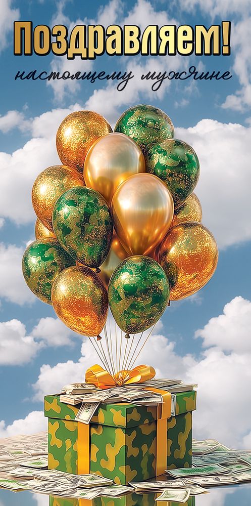 Конверт для денег формата «Евро» предназначен для вручения денежных подарков и сертификатов и ориентирован на использование в ассортименте магазинов подарочной продукции, канцелярии и сувениров. Изделие изготовлено из плотного картона, что обеспечивает стабильную геометрию при транспортировке и выкладке, а также устойчивость к изгибам и разрывам при стандартной эксплуатации. Готовый размер конверта 168 × 84 мм позволяет размещать в нём купюры без сгибов и подходит под большинство стандартных денежных номиналов. На лицевой стороне выполнена полноцветная печать с тематическим оформлением: подарочная коробка в камуфляжной расцветке, связка шаров золотисто-зелёных тонов и денежные купюры, на фоне неба с облаками. Композиция дополнена текстовым поздравлением «Поздравляем! настоящему мужчине», что определяет назначение изделия как конверта для вручения денег мужчинам по случаю дня рождения, профессионального праздника или памятной даты. Отделка включает блестки в лаке золотого цвета, нанесённые по отдельным элементам изображения, за счёт чего достигается выразительный визуальный эффект при сохранении ровной поверхности, удобной для укладки пачками и упаковки в стеллажные короба. Лаковый слой дополнительно защищает печать от истирания, что важно при оптовой логистике и длительном хранении на складе. Конверт имеет фигурную вырубку, формирующую аккуратный край и удобный доступ к вложению, при этом конструкция рассчитана на стандартные технологические операции — фасовку, групповую упаковку, транспортировку без деформации. Внутри предусмотрено поле для личной подписи или краткого поздравления, что повышает удобство использования для конечного покупателя и позволяет универсально включать данную позицию в мужские подарочные линейки. В упаковке 10.
