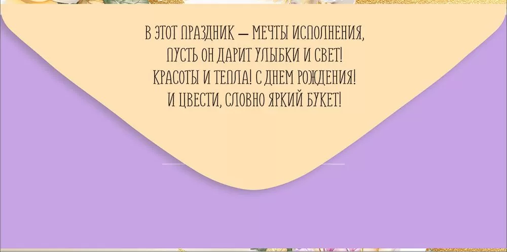 Поздравительный конверт для денег «С Днем рождения!» с классическим ярким дизайном преобразит любое торжество. Чудесная цветочная композиция и отделка золотыми блестками делают внешний вид изделия романтичным, изысканным и праздничным. Нежные приятные оттенки розового и желтого прекрасно сочетаются между собой. Внутри конверта – замечательные стихи с теплыми пожеланиями. Данный дизайнерский конверт для денег идеально подойдет в качестве основного подарка или как приятное дополнение к нему. Внутрь можно поместить любую денежную сумму, подарочный сертификат или билеты на концерт. Благодаря прочным материалам производства и качеству печати изделие удобно транспортировать и хранить – оно надолго сохранит свой яркий внешний вид, не помнется и не выцветет, что делает его не только хорошим подарком, но и прекрасным памятным сувениром!