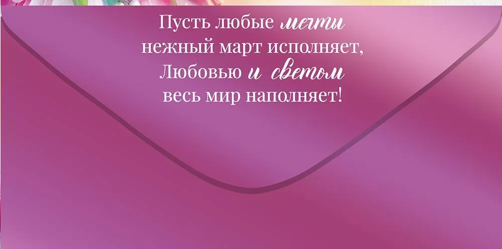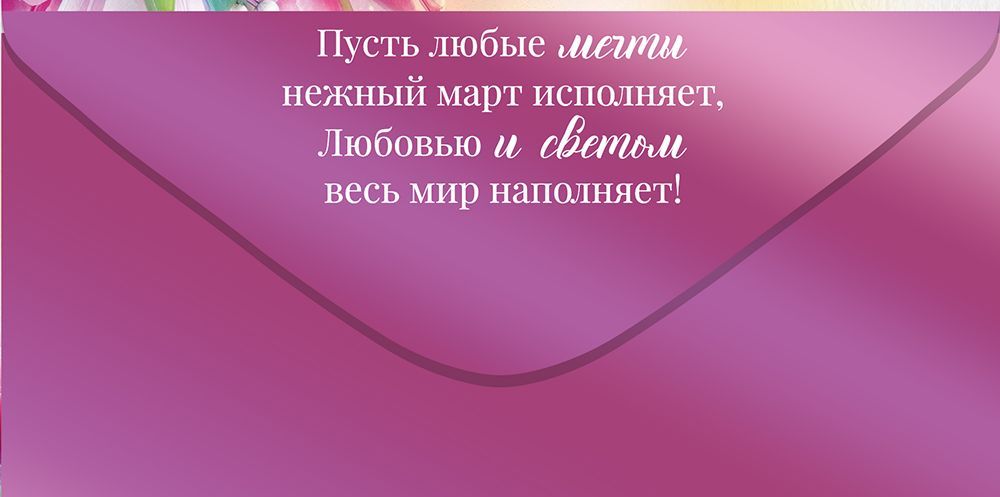 Поздравительный конверт для денег «8 Марта! Чудесной весны!» с романтичным дизайном преобразит чудесный весенний праздник. Волшебные тюльпаны в розовых оттенках, изображенные на изделии, создают неповторимую атмосферу нежности и красоты. Идеальный подарок для каждой женщины! Также внутри находится текст с приятными пожеланиями. Данный дизайнерский конверт для денег идеально подойдет в качестве основного подарка или как приятное дополнение к нему. Внутрь можно поместить любую денежную сумму, подарочный сертификат или билеты на концерт и вручить маме, бабушке или подруге. К тому же подобным презентом можно порадовать коллег по работе, устроив коллективное поздравление. Благодаря прочным материалам производства и качеству печати изделие удобно транспортировать и хранить – оно надолго сохранит свой яркий внешний вид, не помнется и не выцветет, что делает его не только хорошим подарком, но и прекрасным памятным сувениром!