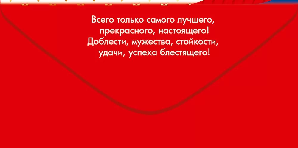 Поздравительный конверт для денег «23 февраля. С Днем защитника Отечества!» с патриотичным дизайном преобразит февральское торжество. Оригинальное композиционное решение, при котором мы видим не просто цифру «23», а ее силуэт. Пятиконечная звезда и российский флаг дополняют изображение и делают его еще более торжественным и запоминающимся. Также внутри находится текст с приятными пожеланиями. Данный дизайнерский конверт для денег идеально подойдет в качестве основного подарка или как приятное дополнение к нему. Внутрь можно поместить любую денежную сумму, подарочный сертификат или билеты на концерт. Благодаря прочным материалам производства и качеству печати изделие удобно транспортировать и хранить – оно надолго сохранит свой яркий внешний вид, не помнется и не выцветет, что делает его не только хорошим подарком, но и прекрасным памятным сувениром!