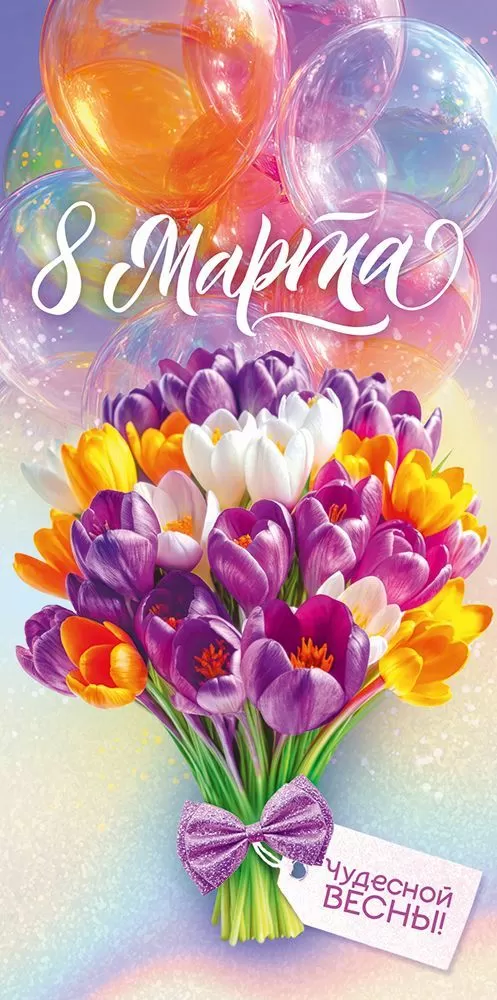 Поздравительный конверт для денег «8 Марта» выполнен в ярком весеннем дизайне. Фиолетово-оранжевые тюльпаны на изображении прекрасно сочетаются с перламутровыми шариками на сиреневом фоне в тех же цветах. Изделие выполнено из прочного материала, имеет высокое качество печати и дополнительные инкрустации в виде блесток в лаке, предупреждая их обсыпание или отслаивание – всё это делает данный конверт отличным памятным сувениром. Во внутренней части напечатаны пожелания в стихах, которые отлично дополнят вложенную в него денежную сумму, подарочный сертификат или билеты на концерт.