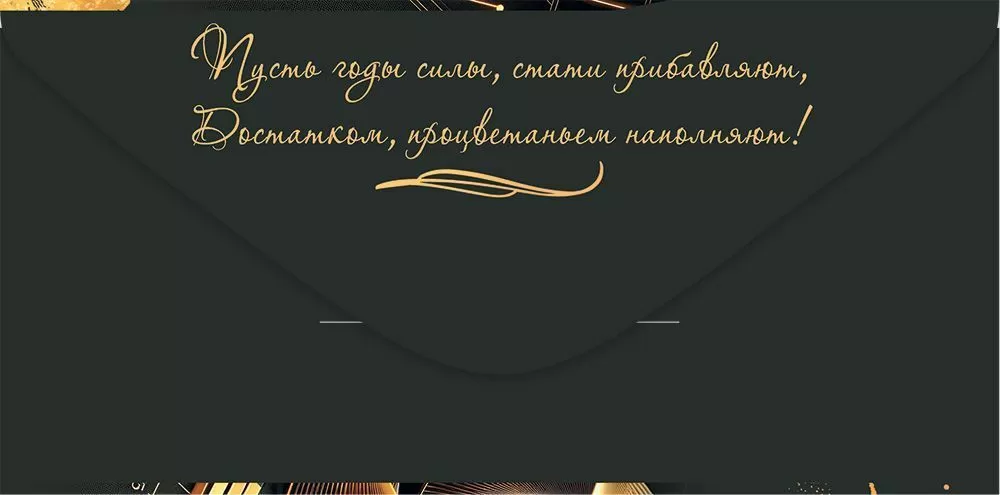 Поздравительный конверт для денег «С Юбилеем!» точно придется по вкусу мужчинам, ценящим статус и роскошь. Золотые карманные часы и ручка добавят благородства, а черный фон визуально подчеркнет их и добавит глубины. Изделие выполнено из прочного материала, имеет высокое качество печати и дополнительные инкрустации в виде страз, добавляющих ему объема, блеска и дороговизны – всё это делает данный конверт отличным памятным сувениром. Во внутренней части напечатаны пожелания в стихах, которые отлично дополнят вложенную в него денежную сумму, подарочный сертификат или билеты на концерт.