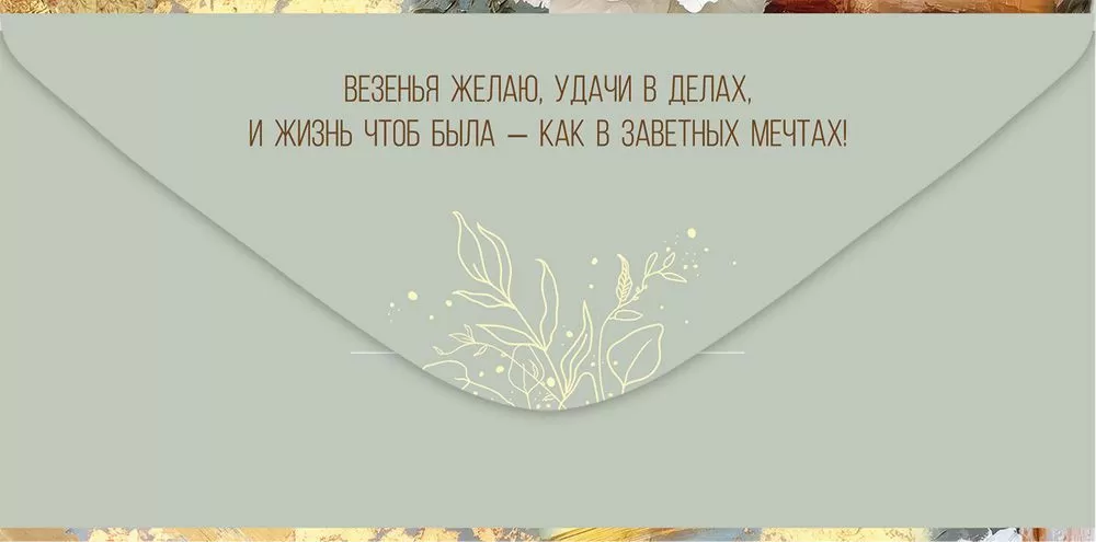Поздравительный конверт для денег «Поздравляю!» преобразит любое торжество! Изображение на лицевой стороне представляет собой нежную флористическую композицию из белых цветов, еще не раскрывшихся бутонов и колосьев пшеницы в золотой вазе, будто нарисованной кистью художника. Нежно-зеленый фон в той же цветовой гамме подчеркнет чистоту оттенков, объединяя композицию в единое целое. Изделие выполнено из прочного материала, имеет высокое качество печати и дополнительные инкрустации в виде золотых блесток в лаке, предупреждая их обсыпание или отслаивание – всё это делает данный конверт отличным памятным сувениром. Во внутренней части напечатаны пожелания в стихах, которые отлично дополнят вложенную в него денежную сумму, подарочный сертификат или билеты на концерт.