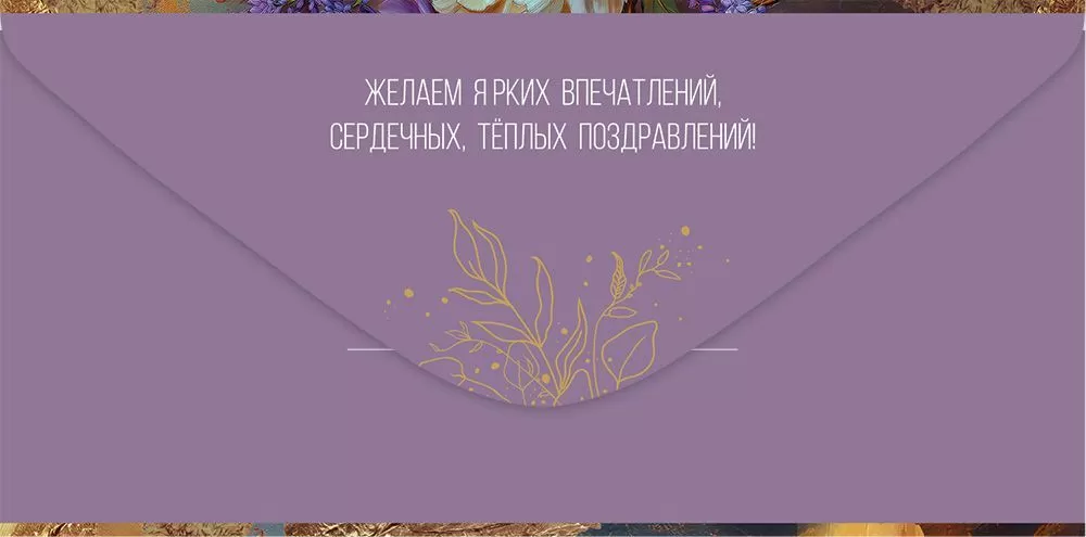 Поздравительный конверт для денег «Поздравляем!» непременно порадует адресата своим цветочным дизайном! Изображение украшено роскошным букетом бело-фиолетовых пионов с зелеными листьями и веточками благоухающей сирени. Дополняет композицию роскошная золотая ваза с литым витиеватым узором, придавая элегантности и роскоши. Изделие выполнено из прочного материала, имеет высокое качество печати и дополнительные инкрустации в виде золотых блесток в лаке, предупреждая их обсыпание или отслаивание – всё это делает данный конверт отличным памятным сувениром. Во внутренней части напечатаны пожелания в стихах, которые отлично дополнят вложенную в него денежную сумму, подарочный сертификат или билеты на концерт.