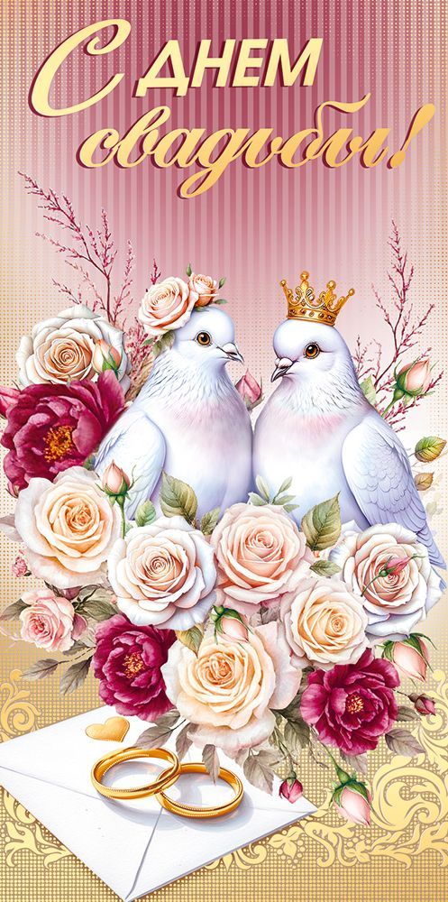 Конверт для денег формата «Евро» предназначен для оформления денежного подарка к свадьбе и включения в ассортимент праздничной продукции. Изделие изготовлено из плотного картона, обеспечивающего форму и устойчивость к сгибам при хранении, транспортировке и передаче получателю. Размер конверта в готовом виде 168 × 84 мм, что соответствует стандартным требованиям к денежным конвертам и позволяет размещать в нём купюры без сгибания, а также вложить поздравительную карточку или небольшой вкладыш. Лицевая сторона оформлена тематической свадебной композицией: пара белых голубей на фоне букета роз и декоративных элементов, дополненных изображением обручальных колец и конверта, что визуально подчёркивает назначение изделия как упаковки для денежного подарка молодожёнам. На лицевой стороне размещён поздравительный текст «С днём свадьбы!», внутри предусмотрен печатный текст-поздравление, позволяющий использовать конверт без дополнительного оформления. Поверхность украшена золотой фольгой, за счёт чего отдельные элементы рисунка и надписи имеют металлизированный блеск, устойчивый к истиранию при аккуратной эксплуатации; такое решение делает конверт более заметным в выкладке и облегчает формирование однородной линейки товаров с фольгированными акцентами. Материал и формат удобны для штабелирования, упаковки по 10 и размещения на полках или в прикассовых зонах, что важно при планировании оптовых закупок и логистики. Для розничного использования конверт подходит как готовое решение для вручения денег на свадьбу, сочетается с большинством стандартных подарочных пакетов и букетов, не требует дополнительной упаковки и может применяться как самостоятельный элемент праздничного оформления подарка.