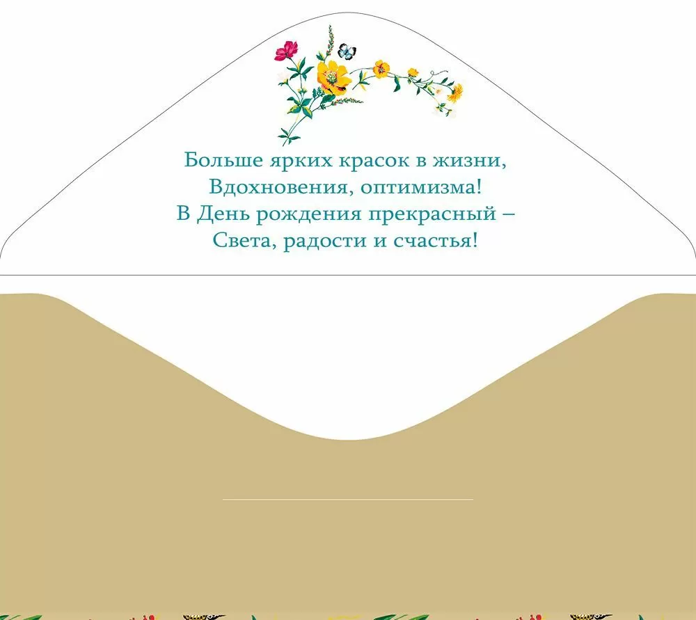Поздравительный конверт для денег «С Днем рождения!» с летним дизайном преобразит любое торжество. Изделие украшено изображениями полевых цветов и порхающих бабочек. Также внутри находится текст с приятными пожеланиями. Данный дизайнерский конверт для денег идеально подойдет в качестве основного подарка или как приятное дополнение к нему. Внутрь можно поместить любую денежную сумму, подарочный сертификат или билеты на концерт. Благодаря прочным материалам производства и качеству печати изделие удобно транспортировать и хранить – оно надолго сохранит свой яркий внешний вид, не помнется и не выцветет, что делает его не только хорошим подарком, но и прекрасным памятным сувениром!
