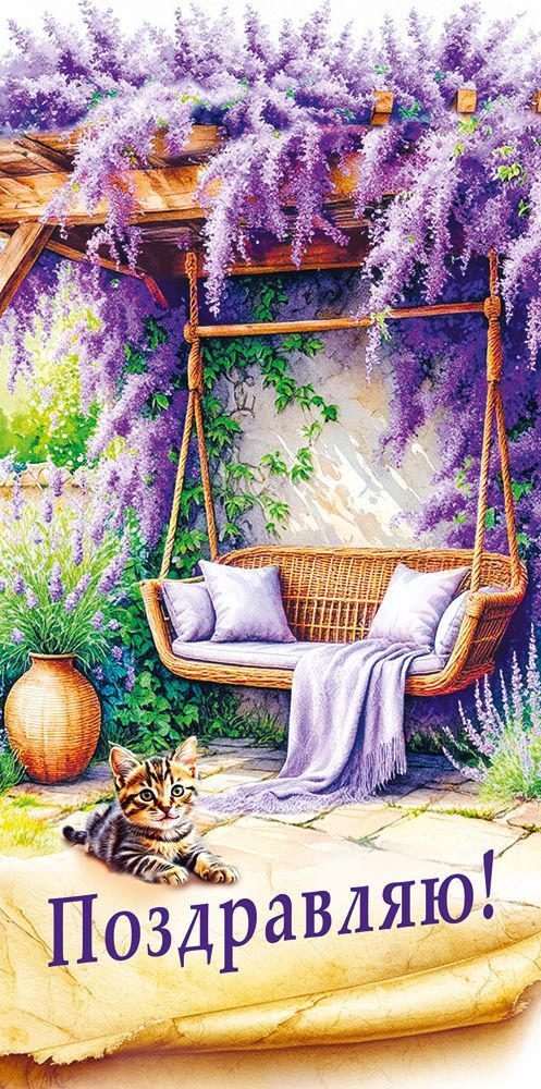 Конверт для денег формата евро предназначен для безопасного и аккуратного вручения денежного подарка и сертификатов стандартных размеров. Изделие выполнено из плотного картона, что обеспечивает форму конверта при транспортировке и хранении, снижает риск заломов и деформации, удобно при складском учёте и выкладке на полке. Готовый размер 168 × 84 мм позволяет использовать конверт в большинстве типовых почтовых и подарочных упаковок, размещать в витринных кассетах и напольных дисплеях. Лицевая сторона оформлена полноцветным изображением с детализированной иллюстрацией: садовая сцена с плетёной подвесной скамьёй, текстильным пледом и подушками, вазой и котёнком на переднем плане, что делает изделие универсальным для поздравлений с днём рождения, семейными и сезонными праздниками, а также как дополнение к подарку коллеге или партнёру. На лицевой стороне размещён текст «Поздравляю!», что исключает необходимость дополнительной открытки при неформальных и деловых поздравлениях. Поверхность украшена блёстками в радужном лаке, за счёт чего отдельные элементы изображения имеют умеренный декоративный блеск и визуально выделяются при искусственном и дневном освещении, оставаясь устойчивыми к истиранию при стандартной эксплуатации. Внутреннее пространство рассчитано на размещение купюр без сгиба и краткого текстового обращения, что удобно как для розничного покупателя, оформляющего индивидуальный подарок, так и для оптовых заказчиков, формирующих ассортимент для сетей, киосков, книжных и канцелярских магазинов. Конверт поставляется в упаковке по 10 штук, что оптимизирует хранение на складе, упрощает инвентаризацию и позволяет формировать равномерные выкладки по тематике и дизайну в торговом зале.