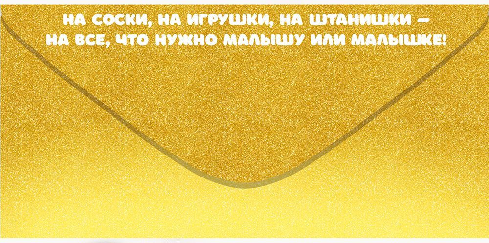 Поздравительный конверт для денег «На самое необходимое» с чудесным дизайном преобразит самое важное жизненное событие. Сочетание нежного белого с ярким золотым цветом и изображения очаровательных детских башмачков, игрушка-лошадка и соска никого не оставят равнодушным. Также внутри находится текст с приятными пожеланиями. Данный дизайнерский конверт для денег идеально подойдет в качестве основного подарка или как приятное дополнение к нему. Внутрь можно поместить любую денежную сумму, подарочный сертификат или билеты на концерт. Благодаря прочным материалам производства и качеству печати изделие удобно транспортировать и хранить – оно надолго сохранит свой яркий внешний вид, не помнется и не выцветет, что делает его не только хорошим подарком, но и прекрасным памятным сувениром!