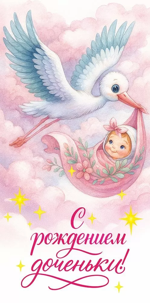 Поздравительный конверт для денег «С рождением доченьки!» с чудесным дизайном преобразит необыкновенное событие каждой семьи. Изделие украшено чудесной иллюстрацией в нежных розовых оттенках. На картинке в стиле акварельного рисунка аист несет очаровательную девочку по небу в облаках. Также внутри находится текст с приятными пожеланиями. Данный дизайнерский конверт для денег идеально подойдет в качестве основного подарка или как приятное дополнение к нему. Внутрь можно поместить любую денежную сумму или подарочный сертификат. Благодаря прочным материалам производства и качеству печати изделие удобно транспортировать и хранить – оно надолго сохранит свой яркий внешний вид, не помнется и не выцветет, что делает его не только хорошим подарком, но и прекрасным памятным сувениром!