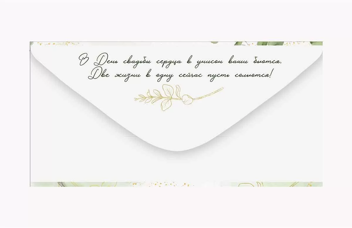 Подарочный конверт для денег – отличный способ сделать практичный и стильный подарок на свадьбу! Открытка привлекает своим нежным оформлением и мягкой бежево-зеленой цветовой гаммой, она обернута фатином со стразами, что добавляет изысканности. Универсальное оформление дает возможность конверту быть идеальным дополнением к любому подарку или самостоятельным презентом. Благодаря применению качественных материалов изображение не потускнеет, а прочный картон станет надежным хранилищем для денежного сюрприза. Индивидуальная прозрачная полиэтиленовая упаковка защитит открытку от загрязнения и мелких повреждений декоративных элементов при транспортировке. Элегантный конверт для денег привлечет взгляды и надолго запомнится молодоженам!