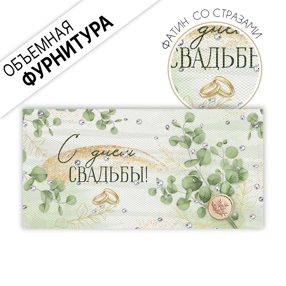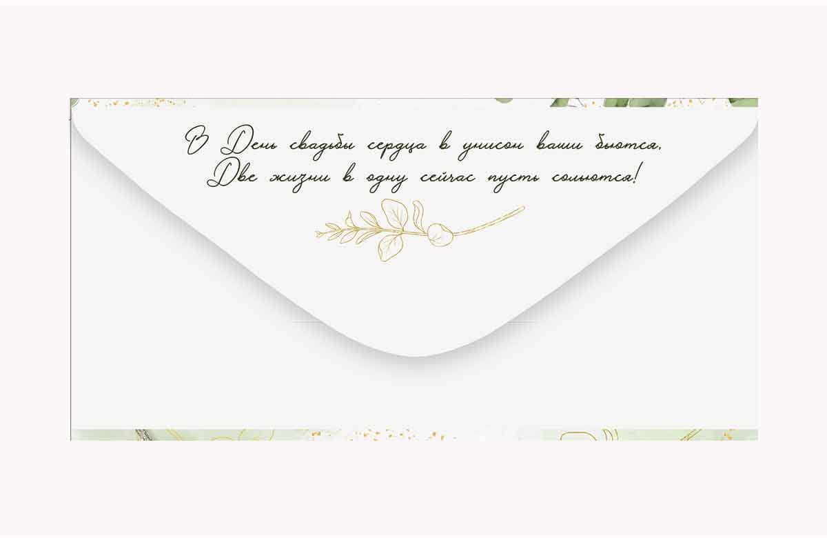 Конверт для денег формата евро предназначен для оформления и вручения денежных подарков на свадьбу и ориентирован на использование в розничной продаже и оптовых поставках для магазинов подарочной и канцелярской продукции. Изделие изготовлено из плотного картона, что обеспечивает стабильную геометрию, сохранность купюр стандартных размеров и аккуратный внешний вид при транспортировке и хранении. Готовый конверт имеет длину 168 мм и ширину 84 мм, что позволяет закладывать внутрь банкноты без сгиба и удобно размещать конверт в витринах, настольных и настенных дисплеях. Лицевая сторона оформлена печатной композицией в светло-зелёной гамме с растительными элементами, надписью «С днём свадьбы!» и декоративными акцентами, дополнительно используется конструктив с фатином, создающий объём и подчёркивающий принадлежность изделия к коллекции с объёмной фурнитурой. Внутри предусмотрен текстовое поздравление, позволяющее использовать конверт как самостоятельный поздравительный носитель без дополнительной открытки; при необходимости остаётся место для подписи и указания дарителя. Отделка не применяется, поверхность остаётся ровной и удобной для машинной или ручной выкладки, упаковки в термоусадочную плёнку, группировки по сериям и формирования подарочных наборов. Конверт рассчитан на единичное использование, при этом плотный картон устойчив к изгибам и истиранию, что важно при перевозке оптовых партий и размещении в торговом зале в течение всего сезонного периода. Нейтральный ботанический дизайн и лаконичное свадебное обращение делают изделие универсальным для разных возрастных категорий молодожёнов и позволяют включать его в базовый ассортимент свадебной группы. В одной упаковке содержится 1 конверт, что удобно для поштучной продажи и точного учёта остатков на складе и в рознице.