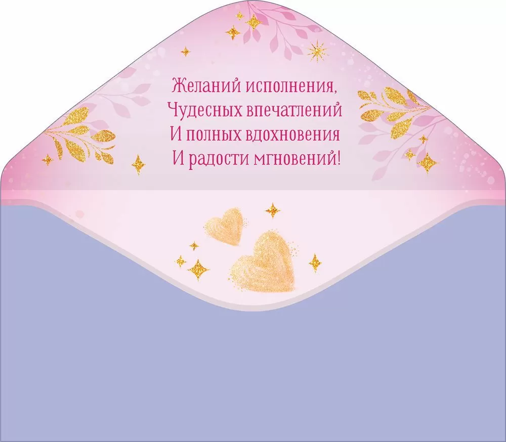 Очаровательный конверт для денег порадует именинницу стильным дизайном. Конверт поможет красиво оформить денежный презент ко дню рождения. Яркий цветочный рисунок дополнен отделкой из сияющих блесток. Внутри на клапане есть теплые пожелания. Такой конверт сделает подарок интересным и запоминающимся!