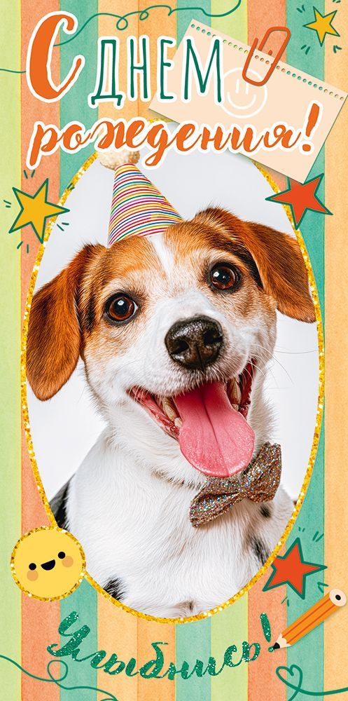 Конверт для денег формата евро предназначен для оформления денежных подарков ко дню рождения. Изделие выполнено из плотного картона, что обеспечивает стабильную форму, устойчивость к деформации при транспортировке и хранении, а также аккуратный внешний вид при выкладке на полке. Размер готового конверта 168×84 мм рассчитан под стандартные купюры и подарочные сертификаты без сгибов, что удобно как для розничной продажи поштучно, так и для формирования оптового ассортимента. На лицевой стороне размещено полноцветное изображение собаки в праздничном колпаке с надписью «С днём рождения!» и декоративными графическими элементами, нижняя часть дополнена текстом «Улыбнись!». Конверт имеет фигурную вырубку, за счёт которой овальное «окно» с изображением выделено в композиции и создаёт завершенный подарочный вид без необходимости дополнительной упаковки. Отделка выполнена с применением золотых блёсток в лаке, что придаёт отдельным элементам надписей и декора выраженный визуальный акцент и повышает износостойкость печати за счёт защитного лаковового слоя. Внутри предусмотрен текстовое поздравление и поле для личной подписи, что сокращает время подготовки подарка и делает изделие готовым решением для розничного покупателя. Конверт поставляется в упаковке по 10 штук, что удобно для оптовых закупок, планирования остатков и равномерного распределения по торговым точкам. Плоская форма и стандартные габариты обеспечивают компактное хранение на складе, возможность использования типовых стеллажей и лёгкую интеграцию в ассортимент поздравительной продукции к дням рождения для детей и взрослых.