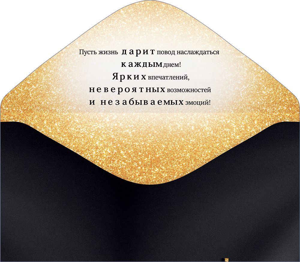Конверт для денег формата «Евро» предназначен для вручения денежного подарка на день рождения и ориентирован на использование в розничной продаже и оптовых поставках для праздничного ассортимента. Изделие изготовлено из плотного картона, обеспечивающего стабильную геометрию, устойчивость к изгибам и сохранение формы при транспортировке и хранении в коробах или лотках. Готовый размер конверта составляет 168 × 84 мм, что позволяет размещать в нем стандартные банкноты без сгибов и деформации, а также легко интегрировать позицию в существующую полочную выкладку формата «Евро». Конверт имеет фигурную вырубку, за счет которой подчеркивается декоративная часть лицевой стороны и повышается визуальная привлекательность изделия на витрине. Двустороннее изображение выполнено в черно-золотой гамме с крупной надписью «С Днем Рождения!» и стилизацией под объемные буквы и декоративные элементы, что делает изделие универсальным для поздравления взрослых получателей разных возрастных групп. В конструкции предусмотрен декоративный элемент с пайетками, создающий эффект объемного блеска и усиливающий праздничное восприятие при искусственном и естественном освещении; дополнительно используется отделка золотыми блестками в лаке, устойчивыми к истиранию при аккуратной эксплуатации. Наличие готового поздравительного текста сокращает время подбора и оформления подарка для конечного покупателя, а для оптового клиента упрощает формирование сбалансированной линейки конвертов с разной степенью декоративности. Внутреннее пространство рассчитано на размещение купюр и при необходимости короткого личного пожелания. Конверт поставляется по 1 штуке, что удобно для поштучной выкладки на крючках, в кассовых зонах и напольных дисплеях, а также позволяет гибко управлять товарными остатками и минимизировать списания при обновлении сезонного ассортимента.