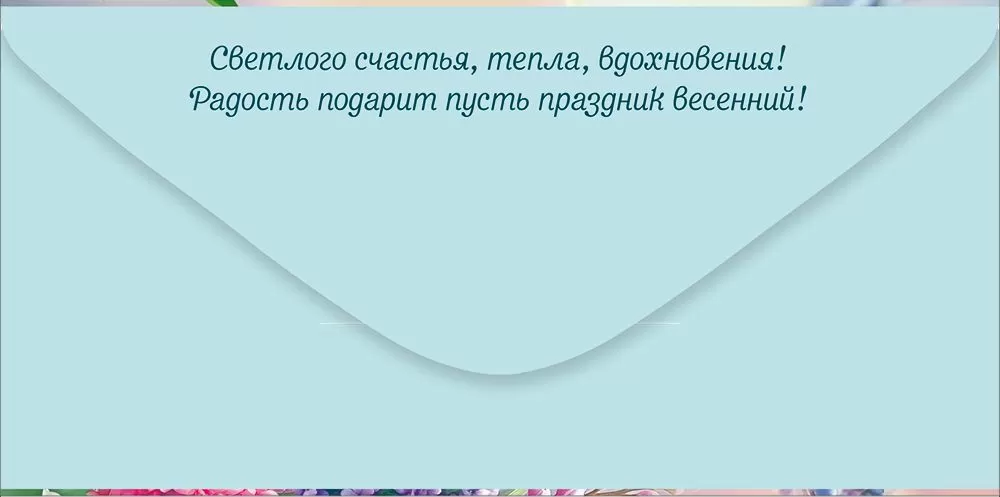 Поздравительный конверт для денег «С 8 Марта!» с очаровательным дизайном преобразит торжество в честь Международного женского дня. Нежные тюльпаны вместе с белоснежными ландышами и пушистыми веточками сирени составляют чудесный весенний букет. Пастельные мягкие оттенки наполнят сердце вдохновением и светлой радостью. Также внутри находится текст с приятными пожеланиями. Данный дизайнерский конверт для денег идеально подойдет в качестве основного подарка или как приятное дополнение к нему. Внутрь можно поместить любую денежную сумму, подарочный сертификат или билеты на концерт. Благодаря прочным материалам производства и качеству печати изделие удобно транспортировать и хранить – оно надолго сохранит свой яркий внешний вид, не помнется и не выцветет, что делает его не только хорошим подарком, но и прекрасным памятным сувениром!