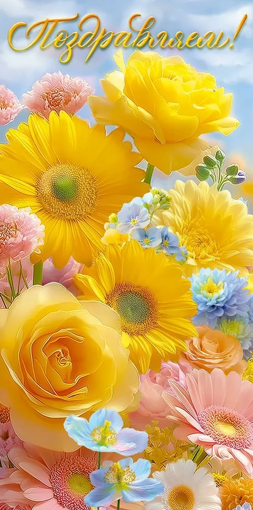 Поздравительный конверт для денег «Поздравляем!» преобразит любое торжество! Изделие украшено позитивным, солнечным изображением желтых, голубых и розовых цветов разных размеров, что придает дизайну глубины и делает его визуально интересным. Фон в виде голубого неба добавляет ему легкости и воздушности. Конверт выполнен из прочного материала, имеет высокое качество печати и дополнительные инкрустации в виде золотых блесток в лаке, который предупреждает их обсыпание или отслаивание – всё это делает данный конверт отличным и долговечным памятным сувениром. Во внутренней части напечатаны приятные пожелания в стихах, которые прекрасно дополнят вложенную в него денежную сумму, подарочный сертификат или билеты на концерт.