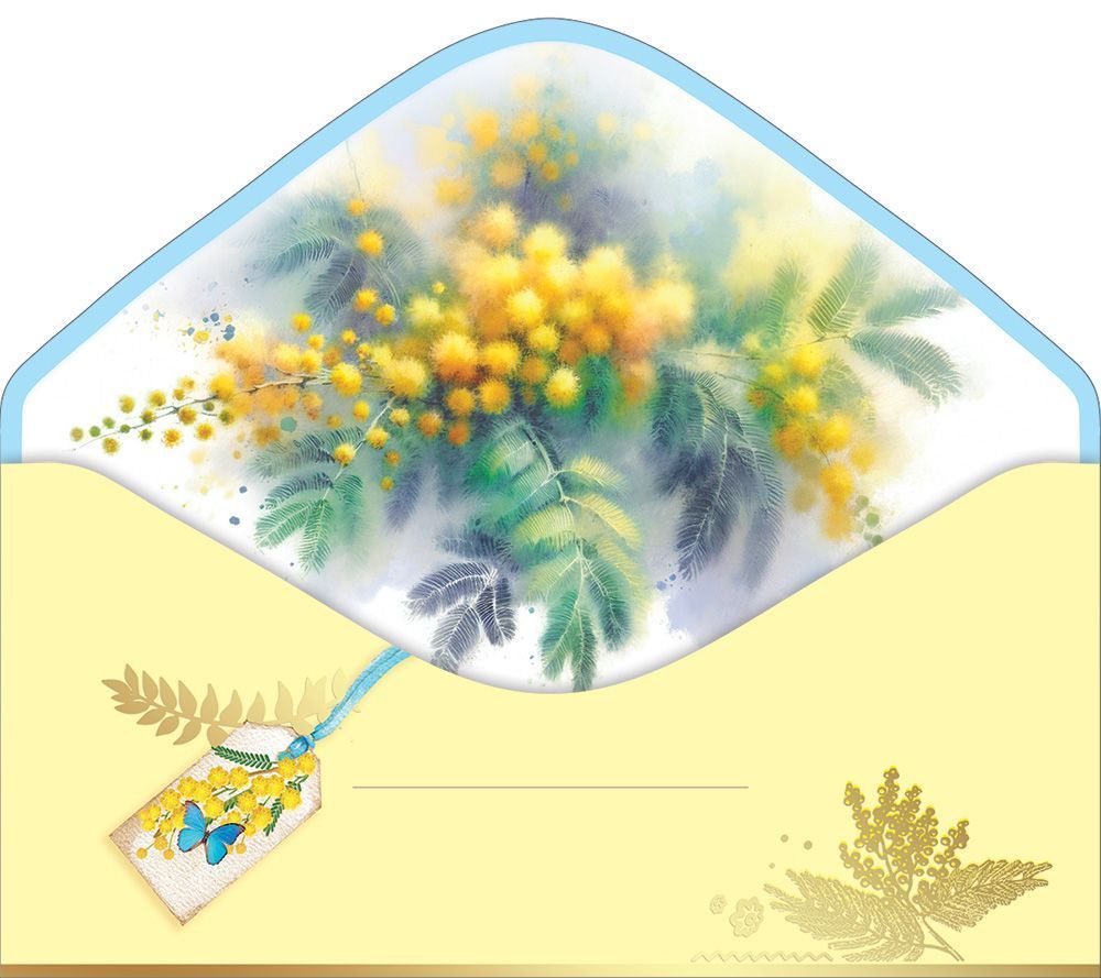 Конверт для денег формата Евро предназначен для упаковки денежных подарков и сертификатов и ориентирован на использование в сезонных коллекциях к 8 Марта. Изделие изготовлено из плотного картона, что обеспечивает стабильную геометрию, устойчивость к изгибам и сохранение внешнего вида при транспортировке и выкладке. Готовый размер конверта составляет 168 × 84 мм, что соответствует распространённым стандартам денежных купюр и позволяет включать конверт в унифицированный ассортимент подарочной продукции. Конструкция с фигурной вырубкой формирует аккуратный клапан и облегчает доступ к вложению без повреждения основы. Лицевая сторона оформлена тематическим весенним дизайном с надписью «8 Марта» и графическими элементами в виде мимозы, бабочек и декоративных деталей, что делает изделие актуальным для поздравлений коллег, партнёров, клиентов и частных получателей. Отделка включает лак soft-touch, создающий приятную на ощупь матовую поверхность с дополнительной защитой от истирания и отпечатков, а также золотую фольгу, подчёркивающую отдельные элементы рисунка и повышающую визуальную выразительность на полке. Внутри конверт не содержит текста, что расширяет сценарии применения: он подходит для нейтральных деловых поздравлений, персонализированных подписей от руки и использования совместно с открытками. Плотный картон и лаковый слой способствуют сохранности вложенных купюр при пересылке в почтовых отправлениях или передаче в корпоративной среде. Конверты поставляются по 10 штук, что удобно для оптовых закупок, формирования единых товарных позиций, планирования остатков и рационального использования торгового пространства. Компактный формат и стандартные габариты облегчают хранение на складе, фасовку по наборным позициям к празднику и выкладку в прикассовой зоне или на специализированных стойках.