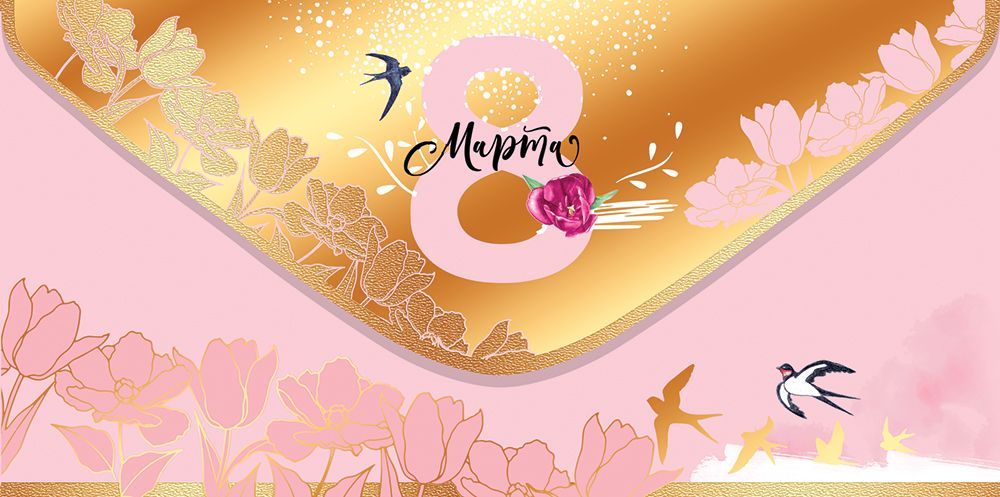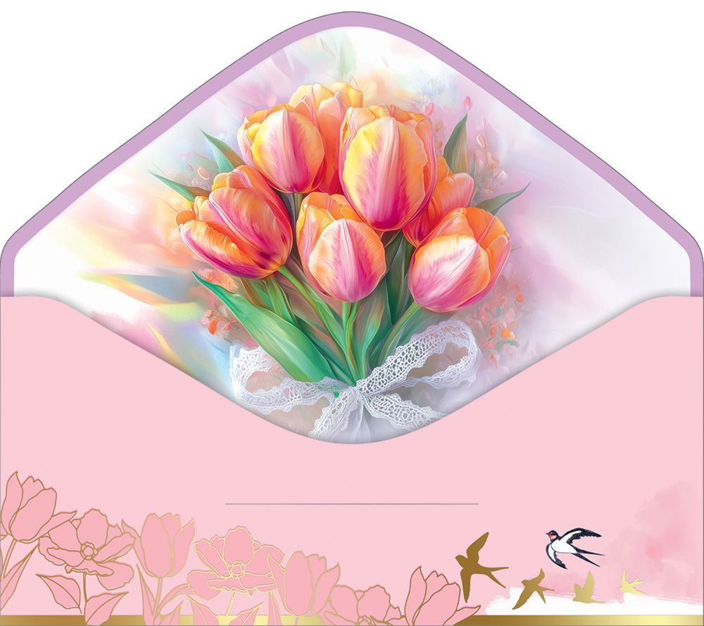 Конверт для денег формата «Евро» предназначен для оформления денежных подарков и сертификатов к 8 Марта и рассчитан на использование в розничной продаже, корпоративных поздравлениях и организованных поздравительных акциях. Изделие выполнено из плотного картона, что обеспечивает форму и устойчивость при хранении, транспортировке и эксплуатации в торговом зале, а также позволяет конверту сохранять внешний вид при закладке купюр стандартного размера. Фигурная вырубка формирует аккуратный контур клапана и ровные линии сгибов, за счет чего конверты удобно штабелируются, не деформируются в стопках и подходят для выкладки в кассовой зоне или на специализированных стойках. Лицевая сторона оформлена тематической композицией к 8 Марта с крупной цифрой «8», цветочным орнаментом и изображениями птиц в розово-золотой гамме; внутренняя часть без текста внутри, что оставляет пространство для индивидуальных надписей, фирменных штампов или вложения стандартных поздравительных вкладышей. Отделка включает лак soft-touch, создающий матовую, тактильно гладкую поверхность, устойчивую к мелким царапинам и отпечаткам, и золотую фольгу, подчеркивающую элементы рисунка и обеспечивающую выразительный, но контролируемый блеск при искусственном и дневном освещении. Точная длина готового изделия составляет 168 мм, ширина 84 мм, что позволяет использовать конверт с большинством распространенных купюр и подарочных карт, а также закладывать внутрь сложенные поздравительные листы малого формата. В одной упаковке 10, что удобно для оптовых закупок под сезонный ассортимент: объем партии легко рассчитывается при планировании количества поздравлений для сотрудников, клиентов или гостей мероприятия, а компактный формат упаковок упрощает хранение на складе и размещение в транспортной таре. Конверт может применяться как самостоятельный элемент подарка или как дополнение к цветам, наборам и сувенирной продукции, обеспечивая единый праздничный стиль и аккуратную подачу денежного вложения.
