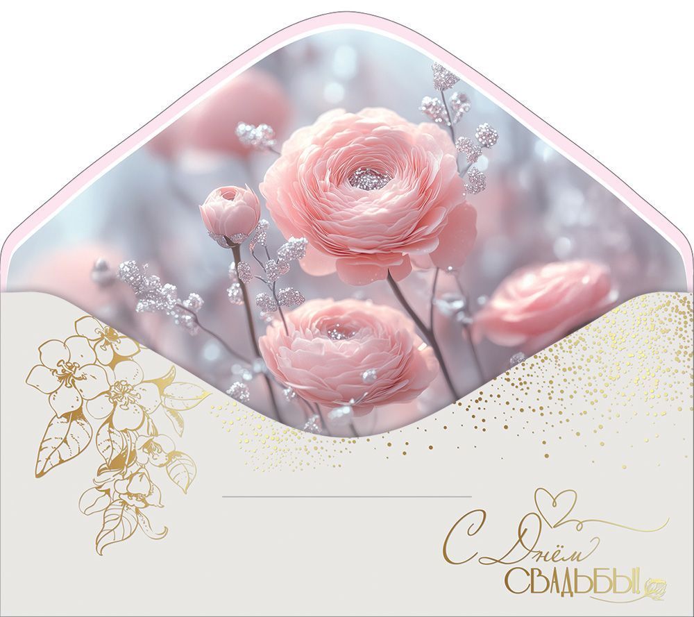 Конверт для денег формата «Евро» выполнен из плотного картона, что обеспечивает стабильную геометрию изделия при хранении, транспортировке и эксплуатации в торговом обороте. Готовый размер 168 × 84 мм позволяет закладывать как стандартные купюры, так и вложенные поздравительные карточки без деформации сгибов. Фигурная вырубка формирует плавный декоративный край клапана и придает конверту законченный презентационный вид, при этом контур вырубки рассчитан так, чтобы изделие сохраняло жесткость и не цеплялось за соседние позиции при выкладке. Наружная сторона оформлена в свадебной тематике: на светлом фоне размещена композиция из флористических элементов и обручальных колец, дополненная надписью «С Днём свадьбы», поэтому конверт ориентирован на использование в качестве упаковки денежного подарка для молодожёнов, на росписи, выездной церемонии или банкете. Отделка включает лак soft-touch и золотую фольгу: мягкое матовое покрытие снижает риск появления мелких царапин и потертостей при многократных перекладках и транспортировке, а тиснение фольгой выделяет контуры рисунка и надписей, делая изделие визуально заметным на полке и в витринной выкладке. Внутри конверт без текста, что расширяет сценарии применения: он подходит для дарения от частных лиц, от коллектива, от организации, а также для использования в салонах свадебных услуг и магазинах подарков как универсальное упаковочное решение. Конверт сохраняет форму при стандартных условиях складского хранения, не требует специальных режимов и удобен для размещения в кассовой зоне и на стоечных дисплеях. В упаковке 10, что обеспечивает удобный учет и пополнение ассортимента при оптовых закупках и позволяет формировать равномерную матричную выкладку по свадебной категории.