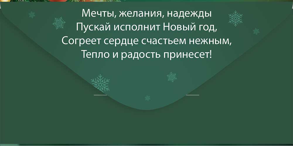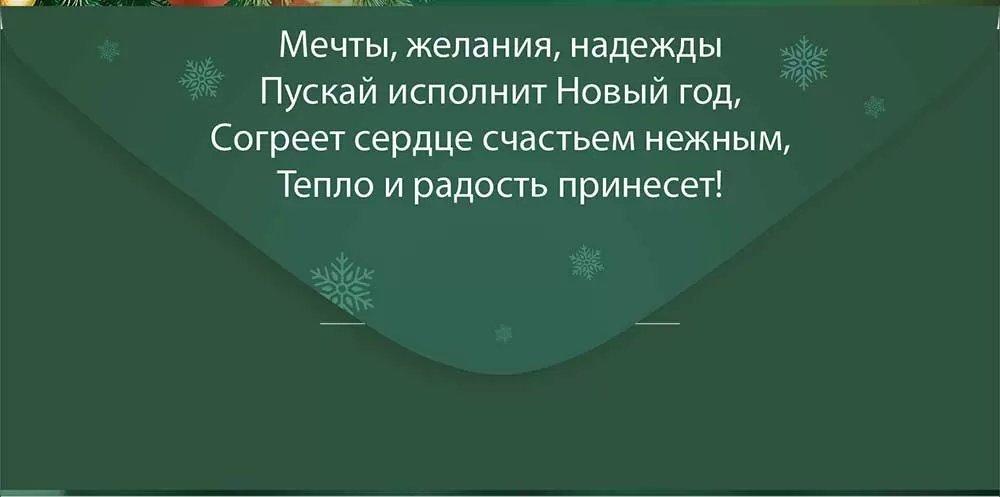 Поздравительный конверт для денег «С Новым годом!» с чудесным дизайном преобразит праздник и сделает любое поздравление ярким и незабываемым. На изделии изображена нарядная елка с крупными новогодними шарами, гирляндой и сияющей звездой на макушке. Глубокий зеленый цвет делает общий внешний вид конверта элегантным и праздничным. Настоящая зимняя сказка! Также внутри находится текст с приятными пожеланиями. Данный дизайнерский конверт для денег идеально подойдет в качестве основного подарка или как приятное дополнение к нему. Внутрь можно поместить любую денежную сумму, подарочный сертификат или билеты на концерт. Благодаря прочным материалам производства и качеству печати изделие удобно транспортировать и хранить – оно надолго сохранит свой яркий внешний вид, не помнется и не выцветет, что делает его не только хорошим подарком, но и прекрасным памятным сувениром!