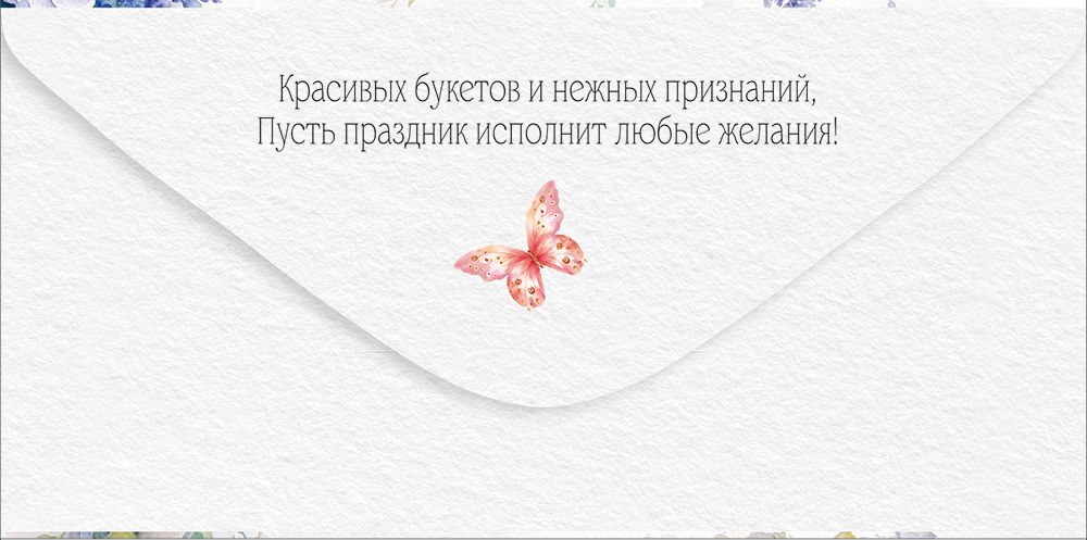 Конверт для денег формата евро предназначен для оформления денежного подарка и сертификатов стандартного размера и ориентирован на регулярное использование в розничной и оптовой торговле. Изделие изготовлено из плотного картона, что обеспечивает достаточную жесткость, устойчивость к изгибам и сохранность купюр при хранении и транспортировке. Габариты конверта 168 × 84 мм позволяют удобно размещать внутри банкноты без сгиба, а также вложенные поздравительные карточки или небольшие печатные вкладыши. Внешняя сторона оформлена полноцветным изображением в технике акварельной флористики: композиция из роз, тюльпанов и других садовых цветов дополнена декоративными бабочками и поздравительным текстом «С Днем рождения!», что делает конверт тематическим решением для дня рождения в широком возрастном и гендерном диапазоне. Печатное изображение дополнено отделкой блестками в лаке с радужным эффектом, за счет чего отдельные элементы рисунка и надписей визуально выделяются при изменении угла освещения; покрытие устойчиво к истиранию при аккуратной эксплуатации и не осыпается при многократном перекладывании товара на витрине. Внутренняя поверхность конверта имеет печатный текст, позволяющий использовать изделие без дополнительной открытки, при этом остается свободное поле для личной подписи и указания имени получателя. Конверты упакованы по 10 штук, что удобно для формирования полочного ассортимента, планирования закупок и оптимизации складских остатков; компактный формат облегчает хранение упаковок в коробах и стандартных стеллажных ячейках. Изделие подходит для использования в цветочных салонах, сувенирных и книжных магазинах, на кассовых зонах супермаркетов, а также в корпоративных отделах для вручения денежных подарков сотрудникам и партнерам, обеспечивая единый визуальный стиль поздравления при масштабных закупках.
