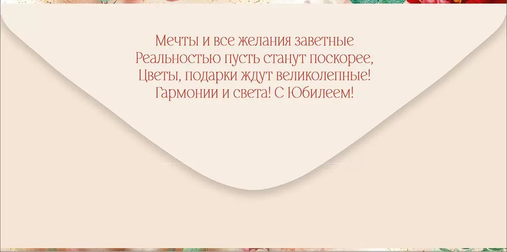 Поздравительный конверт для денег «С Юбилеем!» с роскошным дизайном преобразит любое торжество. Изделие украшено изображениями ярко-красных цветов, которые дополнены всплесками блесток в лаке. Это придает внешнему виду изделия немного волшебного сияния и изыска. Также внутри находится текст с приятными пожеланиями. Данный дизайнерский конверт для денег идеально подойдет в качестве основного подарка или как приятное дополнение к нему. Внутрь можно поместить любую денежную сумму, подарочный сертификат или билеты на концерт. Благодаря прочным материалам производства и качеству печати изделие удобно транспортировать и хранить – оно надолго сохранит свой яркий внешний вид, не помнется и не выцветет, что делает его не только хорошим подарком, но и прекрасным памятным сувениром!