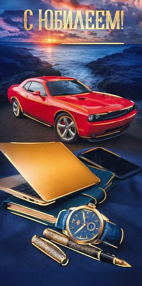 Стильный конверт для денег "С юбилеем!" идеально подходит в качестве подарка или дополнения к подарку. Конверт украшен иллюстрацией и декорирован золотой фольгой. На конверте изображены красный автомобиль на берегу залива и мужские деловые аксессуары: ноутбук, часы, мобильный телефон, записная книжка. Материал – плотный картон. Размеры – 168х84 мм. На нашем сайте можно заказать конверты для денег оптом. Количество экземпляров в одной упаковке – 10 шт.