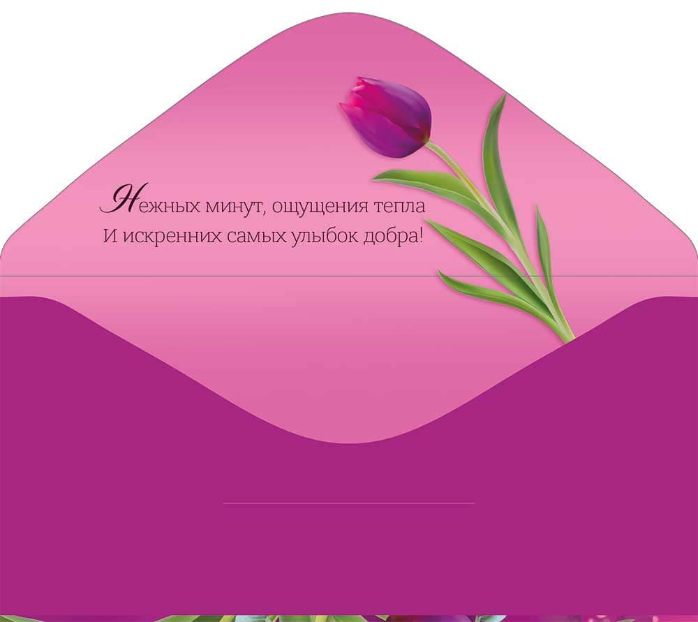 Конверт для денег формата евро предназначен для оформления денежного подарка к Международному женскому дню. Изделие изготовлено из плотного картона, что обеспечивает устойчивость формы, аккуратный внешний вид и сохранность вложения при транспортировке и хранении. Размер готового конверта 168×84 мм позволяет удобно размещать в нем как купюры стандартного европейского и российского формата, так и вложенные поздравительные карточки или небольшие плоские сувениры. Лицевая сторона оформлена полноцветным изображением букета тюльпанов на розово-фиолетовом фоне с надписью «В день 8 Марта», что однозначно обозначает праздничное назначение изделия и упрощает формирование сезонного ассортимента. Двусторонняя печать обеспечивает завершенный вид конверта со всех сторон, благодаря чему он может использоваться без дополнительной упаковки. Внутри предусмотрено текстовое поздравление, что позволяет применять конверт как самостоятельный носитель пожеланий без отдельной открытки, что особенно удобно при массовых поздравлениях в организациях и при корпоративных закупках. Поверхность без отделки сохраняет нейтральный деловой характер изделия, облегчает штабелирование, не бликует при искусственном освещении и не требует специальных условий хранения. Конверты поставляются по 10 штук, что удобно для оптового и мелкооптового заказа, планирования остатков и выкладки на полке. Изделие подходит для розничной продажи в период подготовки к 8 Марта, для использования в магазинах подарков, цветочных салонах, офисах и учебных заведениях, где требуется единый стиль оформления денежных подарков сотрудникам, клиентам или близким.