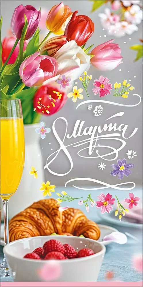Поздравительный конверт для денег «8 марта» преобразит любое торжество! Изделие оформлено в нежных пастельных тонах: на переднем плане изображены чашка с малиной, круассан и бокал с напитком, а на заднем фоне — букет тюльпанов. Витиеватая надпись прекрасно вписывается в этот весенний образ, завершая композицию. Данный конверт выполнен из прочного материала и имеет высокое качество печати, что делает его отличным памятным сувениром. Во внутренней части напечатаны пожелания в стихах, которые отлично дополнят вложенную в него денежную сумму, подарочный сертификат или билеты на концерт.