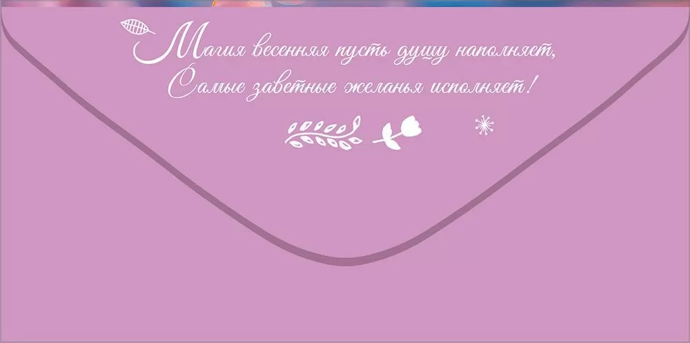Поздравительный конверт для денег "8 Марта. Пусть каждый день счастливым будет!" преобразит любое торжество! Изделие выполнено в нежных розово-голубых тонах и украшено изображением букета розовых тюльпанов в прозрачной стеклянной вазе, по форме напоминающей каплю росы. Теплые пожелания, обрамлённые изящными узорами и сердечками, придают композиции романтичности и праздничного настроения, а общий дизайн создаёт атмосферу тепла, нежности и весенней свежести. Данный конверт выполнен из прочного материала и имеет высокое качество печати, что делает его отличным памятным сувениром. Во внутренней части напечатаны пожелания в стихах, которые отлично дополнят вложенную в него денежную сумму, подарочный сертификат или билеты на концерт.