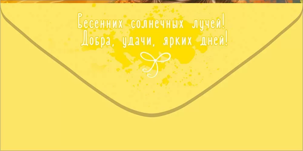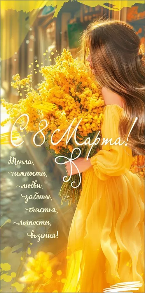 Поздравительный конверт для денег "С 8 Марта! Тепла, нежности, любви..." поразит получательницу своей теплотой и жизнерадостностью! На лицевой стороне изображена девушка в платье из струящейся ткани золотистого оттенка, которая бережно держит пышный букет мимозы — символ весны, нежности и женственности. Фон создаст ощущение тепла, света и свежего мартовского утра, а теплые пожелания с витиеватыми узорами завершат образ, делая его по-настоящему утонченным. Изделие выполнено из прочного материала и имеет высокое качество печати, что делает его отличным памятным сувениром. Во внутренней части напечатаны пожелания в стихах, которые отлично дополнят вложенную в него денежную сумму, подарочный сертификат или билеты на концерт.