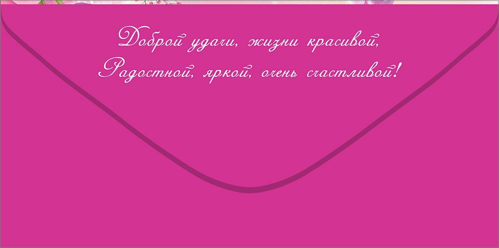 Конверт для денег формата «Евро» предназначен для вручения денежного подарка в универсальном поздравительном формате и ориентирован на стабильное использование в розничной и корпоративной практике. Изделие изготовлено из картона, что обеспечивает достаточную жесткость, устойчивость к сгибам и разрывам, удобство хранения в стопах и транспортировки в коробах без деформации. Габариты готового конверта 168 × 84 мм позволяют размещать внутри купюры стандартного размера без подгибания, а также вкладывать подарочные сертификаты или небольшие плоские вложения. Лицевая сторона оформлена полноцветным изображением с крупной композицией цветов в розово‑лиловой гамме и содержит текстовое поздравление «Поздравляем! От всего сердца», за счет чего конверт подходит для широкого круга поводов: дни рождения, юбилеи, семейные торжества, поздравления коллег и партнеров. Нейтральная по содержанию надпись делает изделие удобным для формирования постоянного ассортимента в торговых точках и для использования в компаниях как универсальный вариант для поздравления сотрудников и клиентов. Внутренняя часть предусматривает размещение денежных купюр и может дополняться рукописным обращением. Отделка без дополнительных эффектов уменьшает риск повреждений при транспортировке, не требует специальных условий хранения и облегчает учет при оптовых поставках. Плотный картонный материал сохраняет форму конверта при выкладке на витрину и в кассовой зоне, не просвечивает вложение и обеспечивает аккуратный внешний вид при вручении. Количество в упаковке 10 позволяет удобно планировать закупку, формировать ассортимент по сериям и цветовым решениям, а также оптимизировать складские остатки для оптовых и розничных покупателей.