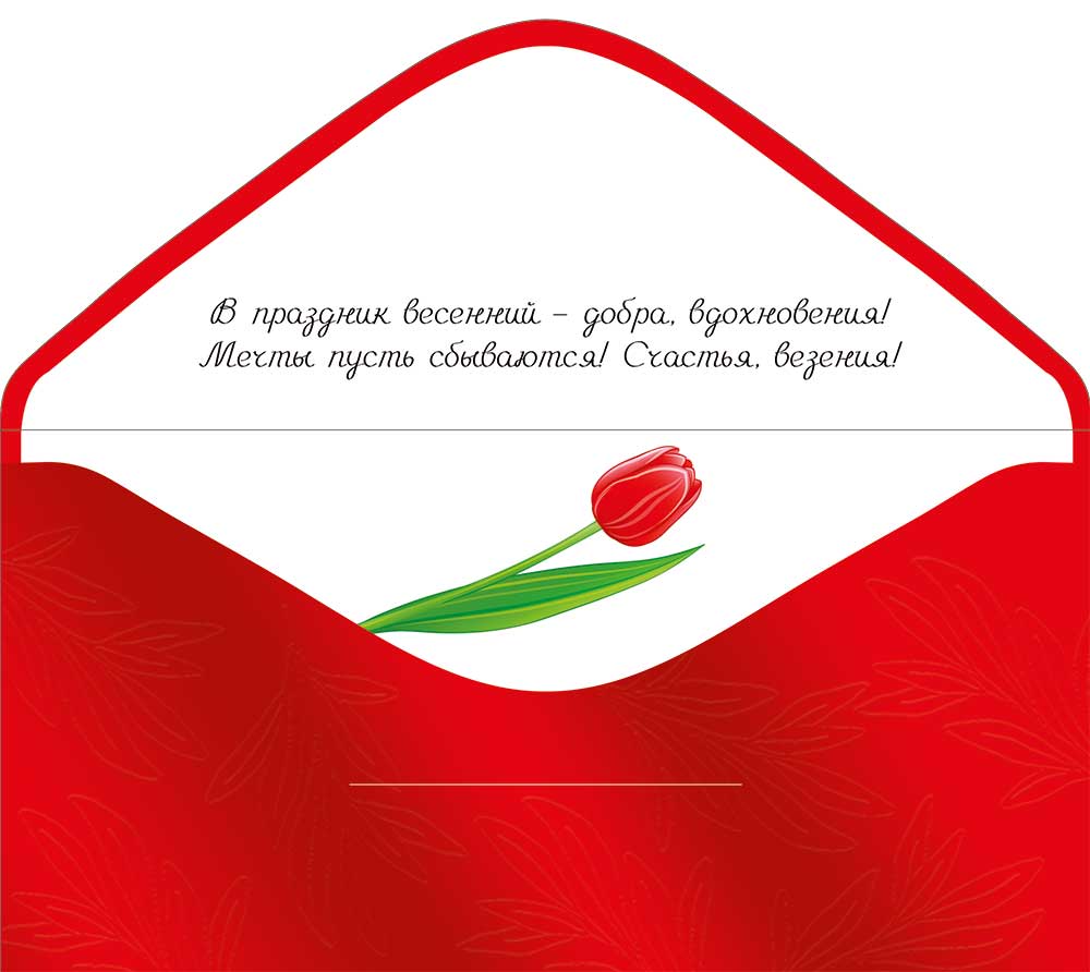 Конверт для денег формата «Евро» предназначен для оформления денежного подарка и вложения плоских сертификатов стандартного размера. Изделие выполнено из плотного картона, что обеспечивает жесткость, стабильную геометрию и сохранность купюр при хранении, транспортировке и передаче получателю. Габариты готового конверта — 168 × 84 мм, что позволяет использовать его в большинстве типовых витрин и напольных дисплеев, а также укладывать в стандартные архивные коробки и транспортную тару без дополнительной подгонки. Лицевая сторона оформлена в красно-белой гамме с крупной цифрой «8», надписью «С 8 Марта!» и изображением тюльпана, что визуально однозначно связывает конверт с поздравлением к 8 Марта и упрощает ориентирование в сезонной выкладке. На красном фоне присутствует ненавязчивый растительный орнамент, создающий дополнительный декоративный эффект без перегрузки композиции. Текстовое поздравление уже нанесено на изделие, поэтому конверт может использоваться как самостоятельный элемент оформления подарка, при необходимости оставляя место для краткого личного пожелания внутри. Отделка выполнена с применением красной фольги, благодаря чему отдельные элементы дизайна имеют выраженный глянцевый блеск и устойчивы к истиранию при многократном контакте в процессе выкладки и выборки покупателями. Материал и конструкция подобраны с учетом потребностей оптовых закупок: конверты хорошо сохраняют форму в стопке, не деформируются при стандартных нагрузках, удобны для машинной или ручной фасовки и штучного учета. Количество в упаковке — 10, что позволяет планировать закупки и распределение по торговым точкам с учетом сезонного спроса. Для розничного покупателя изделие представляет собой готовое решение для аккуратного и нейтрального по стилю вручения денежного подарка женщине на 8 Марта в рабочей, семейной или праздничной обстановке, без необходимости дополнительной упаковки.