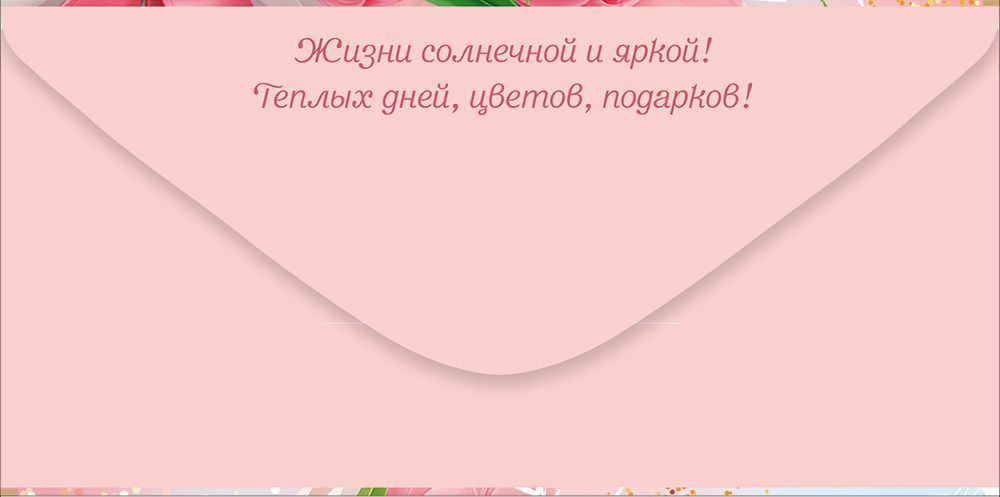 Конверт для денег формата «Евро» предназначен для оформления денежных подарков к 8 Марта и весенним праздничным мероприятиям. Изделие изготовлено из плотного картона, что обеспечивает стабильную геометрию, аккуратный внешний вид и удобство при хранении и транспортировке в оптовых партиях. Размер конверта в готовом виде составляет 168 × 84 мм, формат совместим с большинством стандартных денежных купюр и подарочных сертификатов, что упрощает планирование ассортимента для розничных точек. Лицевая сторона оформлена полноцветной печатью с изображением букета розовых тюльпанов и ландышей, дополненной надписями «8 Марта» и «С Праздником Весны!», что позволяет использовать конверт как самостоятельный поздравительный элемент без необходимости в дополнительной открытке. Золотая фольга в оформлении придаёт надписям и декоративным элементам выразительность и повышает износостойкость ключевых деталей дизайна, сохраняя презентабельный вид при частых перекладках, выкладке в прикассовой зоне и на витринах. Внутренняя часть содержит текстовое поздравление, что облегчает выбор конечному покупателю и сокращает время обслуживания в рознице. Конверт рассчитан на единичное и серийное использование в корпоративных поздравлениях: плотный картон устойчив к изгибам, не деформируется в стандартных транспортных коробах и почтовых отправлениях, удобен для фасовки и учёта на складе. Универсальная весенняя тематика и нейтральный стиль надписей делают изделие подходящим для поздравления сотрудников, партнёров, клиентов и частных адресатов разных возрастных групп. В упаковке 10 штук, что оптимально для формирования полочного запаса, планирования закупок и равномерного распределения по торговым точкам.