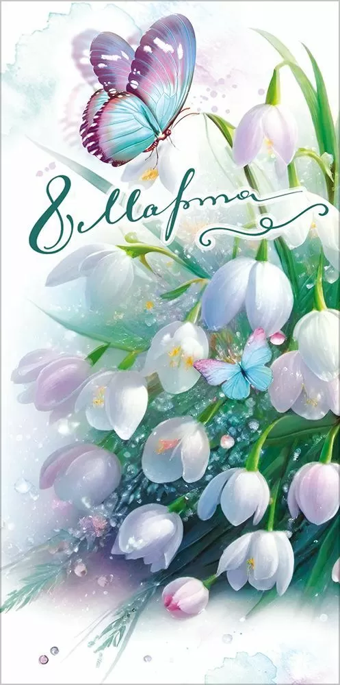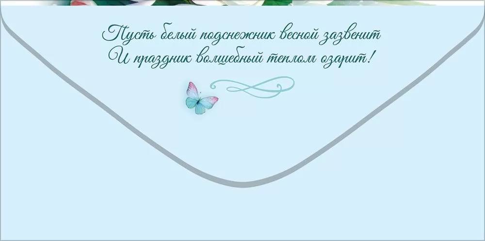 Поздравительный конверт для денег «8 Марта» с весенним дизайном преобразит Международный женский день. Букетик белоснежных подснежников с нежными трепетными лепестками и зелеными стебельками украшают данное изделие и делают его внешний вид волшебным и оригинальным. Изображения чудесных бабочек наполняют изображение легкостью и красотой. Также внутри находится текст с приятными пожеланиями. Данный дизайнерский конверт для денег можно вручить как основной презент или в дополнение к нему. Удобный евроформат позволяет поместить внутрь любую денежную сумму, подарочный сертификат или билеты на концерт. Благодаря прочным материалам производства и качеству печати изделие удобно транспортировать и хранить – оно надолго сохранит свой яркий внешний вид, не помнется и не выцветет, что делает его не только хорошим подарком, но и прекрасным памятным сувениром!