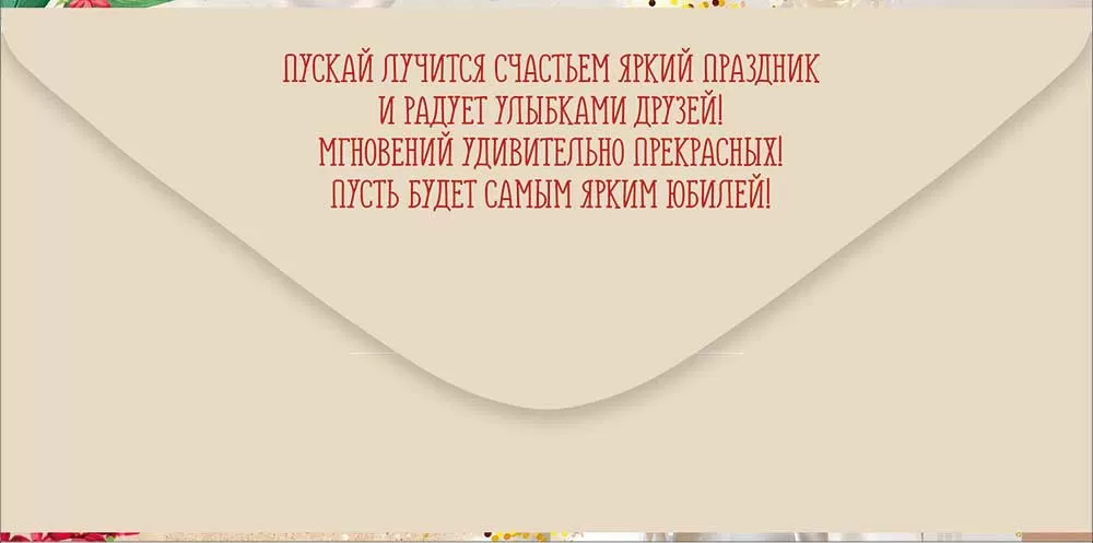 Конверт изготовлен из плотного, качественного материала и отличается высоким разрешением печати, благодаря чему выглядит стильно и презентабельно. Он станет не просто упаковкой для подарка, а красивым и памятным сувениром! Внутри напечатаны теплые пожелания в стихах, которые отлично дополнят вложенную в него денежную сумму, подарочный сертификат или билеты на концерт.