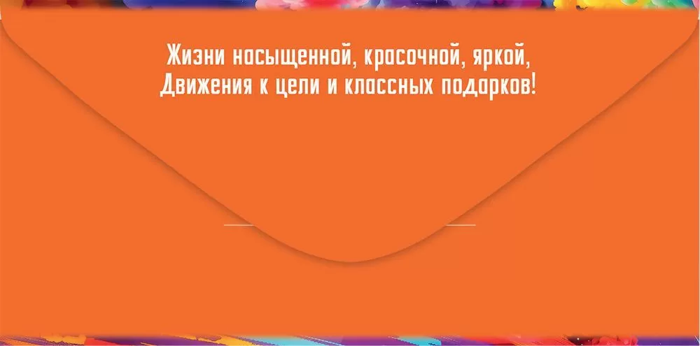 Поздравительный конверт для денег «С Днем рождения! Живи ярко!» с ярким дизайном преобразит любое торжество. В центре красочной композиции – стильный внедорожник, который врывается на передний план из цветного облака красок. Сочные цвета хорошо сочетаются друг с другом и выгодно подчеркивают динамичность изображения. Также внутри находится текст с приятными пожеланиями. Данный дизайнерский конверт для денег идеально подойдет в качестве основного подарка или как приятное дополнение к нему. Внутрь можно поместить любую денежную сумму, подарочный сертификат или билеты на концерт. Благодаря прочным материалам производства и качеству печати изделие удобно транспортировать и хранить – оно надолго сохранит свой яркий внешний вид, не помнется и не выцветет, что делает его не только хорошим подарком, но и прекрасным памятным сувениром!
