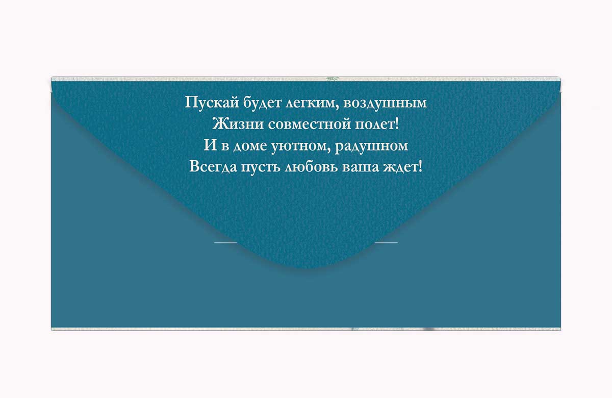 Конверт для денег формата «Евро» предназначен для оформления денежного подарка на свадьбу и построен на жесткой основе из картона, что обеспечивает стабильную геометрию и сохранность вложения при хранении, транспортировке и передаче адресату. Готовое изделие имеет длину 168 мм и ширину 84 мм, размеры соответствуют стандартному формату большинства купюр, что удобно для оптового формирования ассортимента и позволяет использовать конверт в типовых витринных и складских решениях. Лицевая сторона оформлена свадебной композицией с изображением букета нежных цветов и декоративных листьев, дополненных пером, лентой и графическим фоном с имитацией россыпи страз, а также парой обручальных колец и поздравительной надписью «С Днем свадьбы!», что однозначно определяет тематику и снижает риск ошибочного выбора при массовых закупках. Конструкция дополнена фатином, создающим объемный полупрозрачный слой над изображением, за счет чего конверт визуально выделяется в линейке стандартных бумажных изделий и может использоваться как самостоятельный элемент подарочного оформления без дополнительной упаковки. Отделка не применяется, поверхность остается ровной, без тиснения и лакирования, что упрощает укладку в стеллажи и коробки, снижает риск повреждения покрытия при пересортице и многоразовых перегрузках. Внутри предусмотрено печатное поздравление по случаю свадьбы, поэтому изделие не требует дополнительной открытки и подходит для розничного покупателя, которому важно быстро подготовить подарок без сложного подбора сопутствующих товаров. Плотный картон обеспечивает достаточную жесткость клапана и устойчивость к изгибам, что актуально при оптовых поставках в термоусадочной пленке или коробах. Нейтральная по цветовой гамме светлая композиция с акцентом на классические свадебные символы делает конверт универсальным решением для широкого круга получателей и позволяет включать его в базовый ассортимент к свадебному сезону. Количество в упаковке: 1.