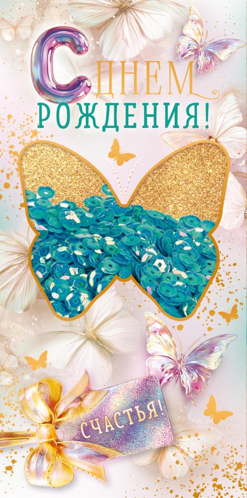 Конверт для денег формата евро выполнен из плотного картона и предназначен для дарения денежных средств или подарочных сертификатов на день рождения. Габариты готового изделия 168 × 84 мм обеспечивают совместимость с большинством стандартных купюр и удобство размещения в витринных и складских лотках. Конверт имеет фигурную вырубку в виде крупного декоративного элемента, за счёт которой изделие выделяется в ассортиментной выкладке, при этом геометрия контура выдержана с высокой точностью, что важно при хранении стопами и упаковке в термоусадочную плёнку. Лицевая и оборотная стороны оформлены полноцветным изображением с тематикой поздравления, предусмотрен встроенный текст «С Днём рождения!» и пожелание счастья, что позволяет использовать конверт как самостоятельное поздравительное изделие без дополнительной открытки. Конструкция дополнена прозрачным окошком с подвижными пайетками, размещёнными в области декоративной бабочки; пайетки надёжно зафиксированы в замкнутом контуре, устойчивы к рассыпанию и рассчитаны на многократное механическое воздействие при осмотре покупателями. Отделка включает золотую фольгу, нанесённую на элементы фона, контур бабочки и отдельные акценты, что повышает износостойкость печати и устойчивость к истиранию при транспортировке и частом перекладывании в оптовых партиях. Внутри предусмотрено поле для личной подписи и размещения купюр, клапан конверта рассчитан на стандартное ручное закрывание без дополнительных аксессуаров. Двустороннее изображение облегчает экспозицию на прилавке и подвесных стендах, позволяя демонстрировать товар с любой стороны. Конверт поставляется по 1 штуке, что удобно для поштучной выкладки и формирования комбинированного ассортимента праздничных товаров.