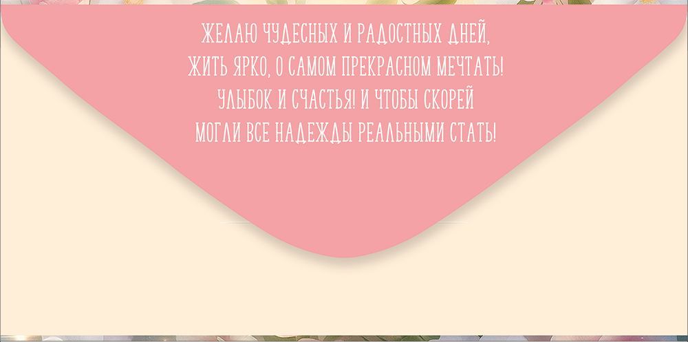 Конверт для денег формата «евро» предназначен для денежного подарка и подарочных сертификатов стандартных размеров и ориентирован на использование в розничной продаже и оптовых поставках для универсальных поздравительных поводов. Изделие изготовлено из плотного картона, что обеспечивает стабильную геометрию, устойчивость к изгибам и разрывам при транспортировке, хранении и эксплуатации в торговом зале. Готовый размер конверта составляет 168 × 84 мм, что удобно для выкладки в кассовых зонах, на полочных дисплеях и в напольных стойках, а также совместимо с большинством стандартных файлов, коробов и лотков для полиграфической продукции. Лицевая сторона оформлена крупной цветочной композицией в мягких розово-кремовых тонах с акцентом на пышные бутоны, дополнена текстом «Поздравляю! От всей души!», что делает конверт подходящим для дней рождения, юбилеев, семейных торжеств, профессиональных праздников и других поводов, не требующих узкоспециализированной тематики. Поверхность имеет декоративное покрытие блестками в радужном лаке, за счет чего создается умеренный перелив при искусственном и естественном освещении, повышается визуальная заметность товара на полке и формируется законченный подарочный вид денежного вложения без дополнительной упаковки. Внутренняя часть рассчитана на размещение купюр и короткого личного пожелания; плотность картона позволяет сохранять форму даже при максимальном заполнении. Конверт удобен для розничного покупателя: не требует подбора по событию, сочетается с большинством подарочных пакетов и коробок, легко помещается в стандартные сумки и клатчи. Для оптового сегмента изделие поставляется по 10 штук, что упрощает учет, формирование ассортимента и планирование выкладки в сетевой и несетевой рознице, а также в сувенирных и книжных магазинах. Универсальный дизайн и нейтральный поздравительный текст обеспечивают стабильный спрос в течение всего года и позволяют использовать конверт как базовую позицию в линейке подарочной полиграфии.