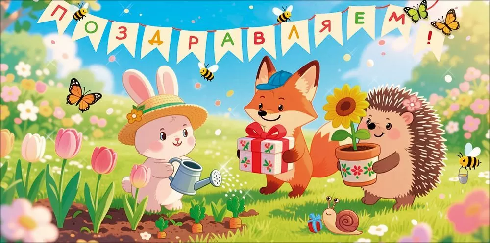 Конверт для денег «Поздравляем!» (зайчик, лисенок и ежик в саду)