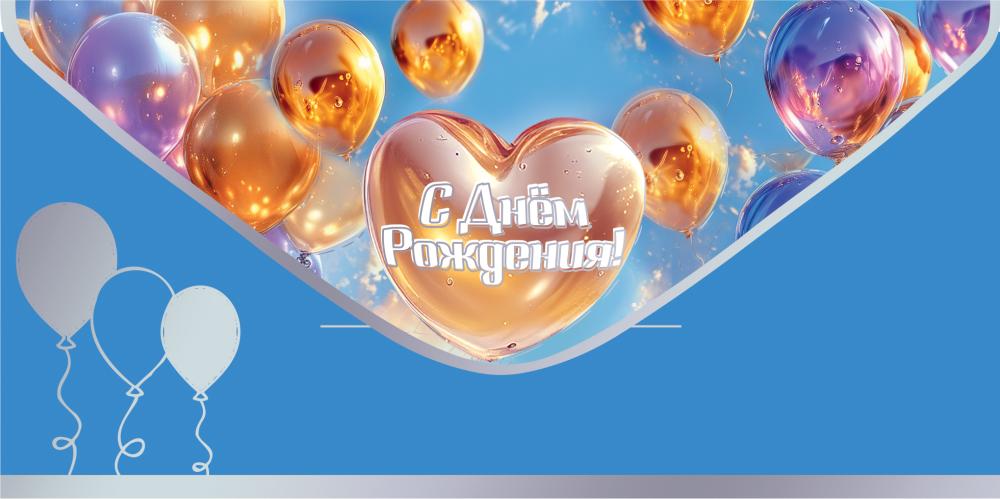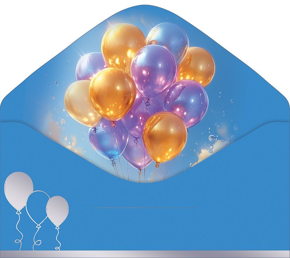 Конверт для денег формата «Евро» изготовлен из плотного картона, рассчитан на безопасное размещение стандартных купюр и подарочных сертификатов. Готовое изделие имеет размеры 168 × 84 мм, что упрощает планирование выкладки и хранение на стеллажах, в ячейках и лотках. Конверт выполнен с фигурной вырубкой, за счёт которой лицевой клапан образует выразительную декоративную линию и частично открывает внутренний рисунок, что удобно при формировании витринных экспозиций и тематических подборок. Двустороннее изображение выдержано в праздничной стилистике: на лицевой стороне размещена композиция из воздушных шаров с центральным шаром в форме сердца и надписью «С Днём Рождения!», фон — небо с облаками и объёмные переливы, создающие эффект глубины; на оборотной стороне сохранена единая цветовая гамма с дополнительными декоративными элементами. Внутренняя часть конверта без текста, что позволяет использовать его как универсальный носитель для денежных подарков на дни рождения взрослых и детей, корпоративные поздравления, поощрения сотрудников и партнёров, а также для индивидуальных надписей от дарителя. Отделка включает soft-touch лак, придающий поверхности тактильно мягкий, «бархатистый» эффект и повышающую устойчивость к истиранию, а также серебряную фольгу, выделяющую отдельные элементы дизайна и обеспечивающую аккуратный блеск без осыпания при стандартной эксплуатации и транспортировке. Материал и отделка подобраны с учётом серийного использования: конверт сохраняет форму, не деформируется при нормальной влажности, подходит для штучной продажи и формирования готовых подарочных наборов. В упаковке 10 конвертов, что удобно для оптовых закупок, планирования остатков и равномерного распределения по торговым точкам или внутренним нуждам компании.
