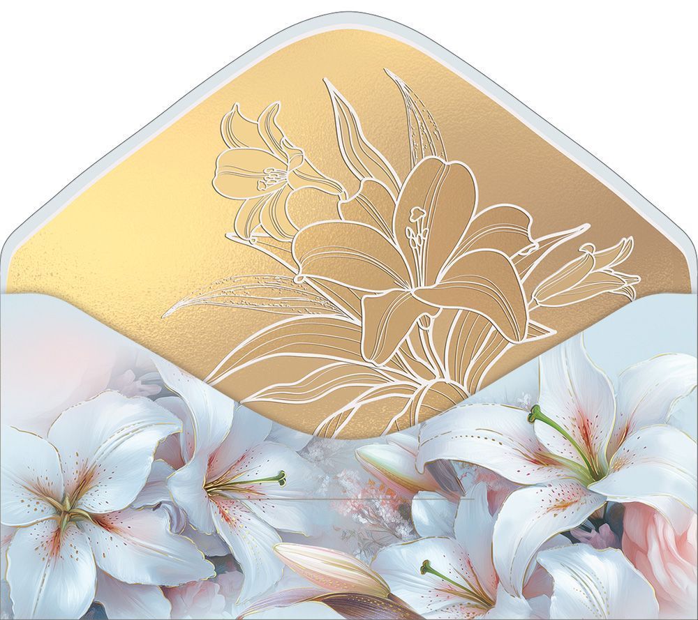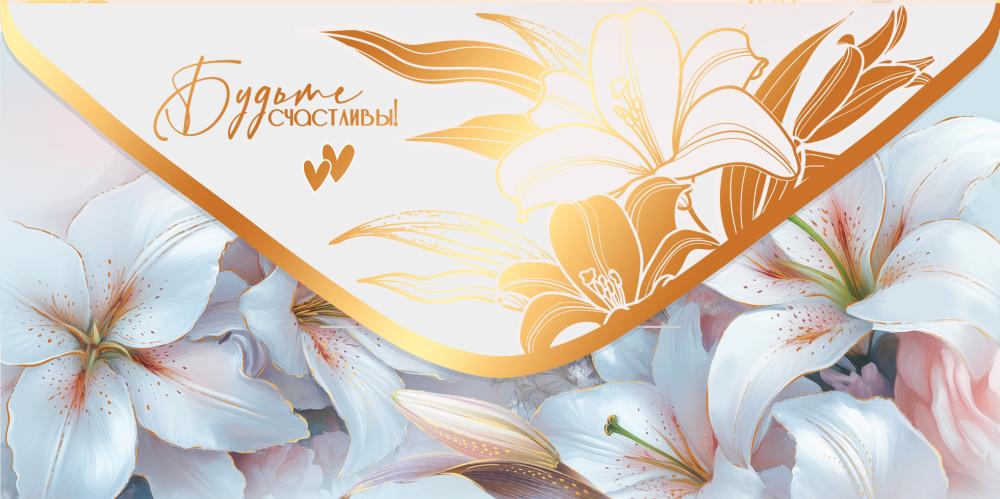 Конверт для денег формата евро предназначен для оформления денежных подарков в розничных и корпоративных сценариях: на свадьбу, юбилей, семейные торжества и официальные мероприятия. Изделие выполнено из плотного картона, обеспечивающего стабильную геометрию конверта, устойчивость к сгибам и истиранию при транспортировке и хранении. Готовый размер 168 × 84 мм позволяет размещать внутри стандартные денежные купюры без сгибания, а также подарочные сертификаты соответствующего формата. Конверт имеет фигурную вырубку клапана, за счет чего образуется аккуратный декоративный край, повышающий визуальную выразительность при сохранении удобства закрывания. Двустороннее изображение с фронтальной и оборотной печатью выполнено в единой композиции с крупными светлыми лилиями и декоративными элементами; на лицевой стороне предусмотрена зона с уже нанесённой поздравительной фразой «Будьте счастливы!», внутренняя поверхность остаётся без текста и позволяет самостоятельно сделать надпись или использовать конверт в рамках корпоративного протокола. Отделка включает лак soft-touch, создающий матовую, слегка бархатистую на ощупь поверхность, устойчивую к появлению отпечатков пальцев и мелких царапин, а также золотую фольгу, применённую для акцентирования контуров рисунка и надписи; такая комбинация обеспечивает стабильный внешний вид при многократном перекладывании изделий в процессе оптовой логистики и выкладки в торговом зале. Точные размеры, однородность картона и аккуратная вырубка облегчают механизированный или ручной учёт, фасовку и штабелирование. В одной упаковке 10 конвертов, что удобно для формирования ассортимента в розничной точке, при подготовке наборов к праздничным сезонам и для планирования оптовых закупок по количеству кассовых мест или подарочных комплектов.
